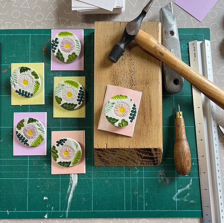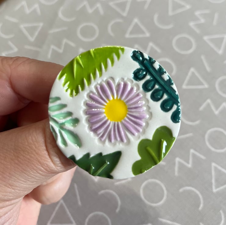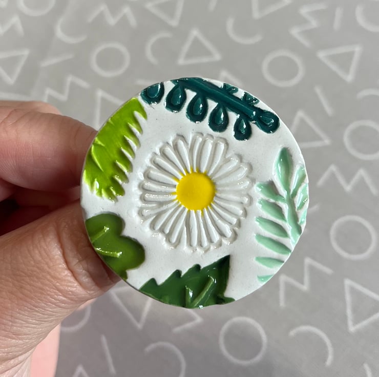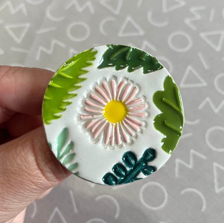 Next to the fun bit, applying colour! I hand paint each brooch using a combination of pastel coloured daisies and leafy coloured underglazes. Before dipping in a glossy transparent glaze and firing for the final time. A brooch pin is then attached to the reverse and ta-da it’s ready to wear!