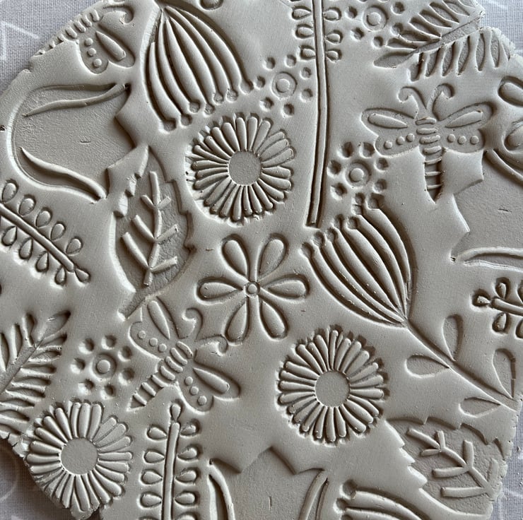 Made from white earthenware clay, these textured brooches are handmade from start to finish. Initially texture is applied to the surface of the clay using a decorative wooden blocks with a variety of leaf shapes and a daisy design. Each piece is then air dried for several days before being kiln fired to form bisqueware.