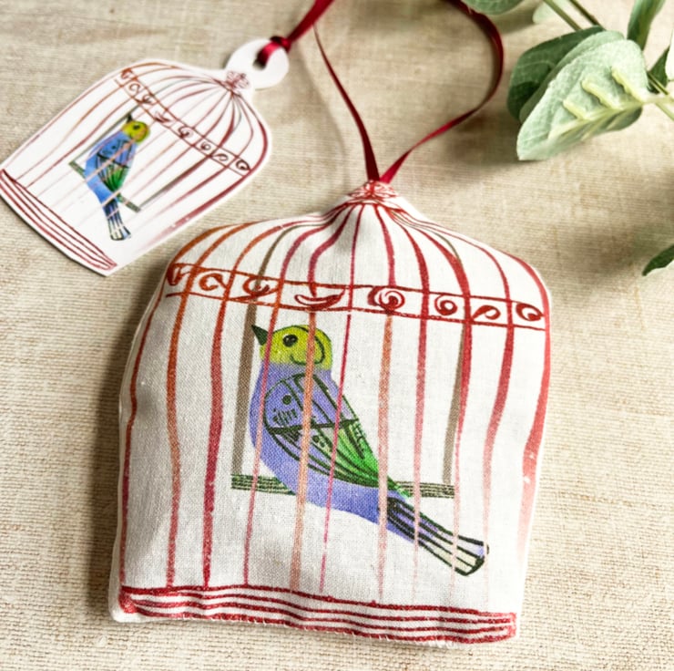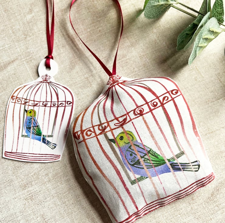 The design has been printed onto 156gsm cotton fabric with plain white on the reverse and finished off with ribbon loop.