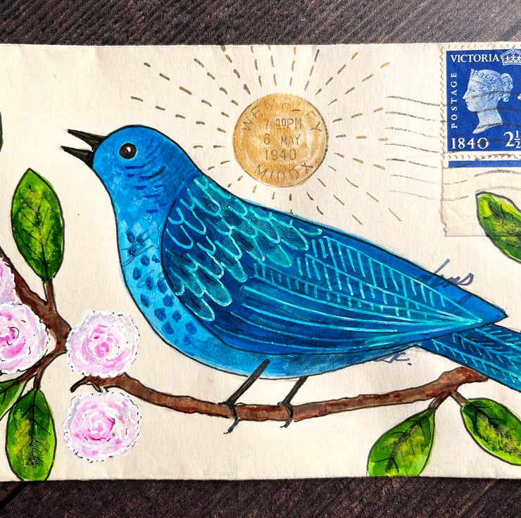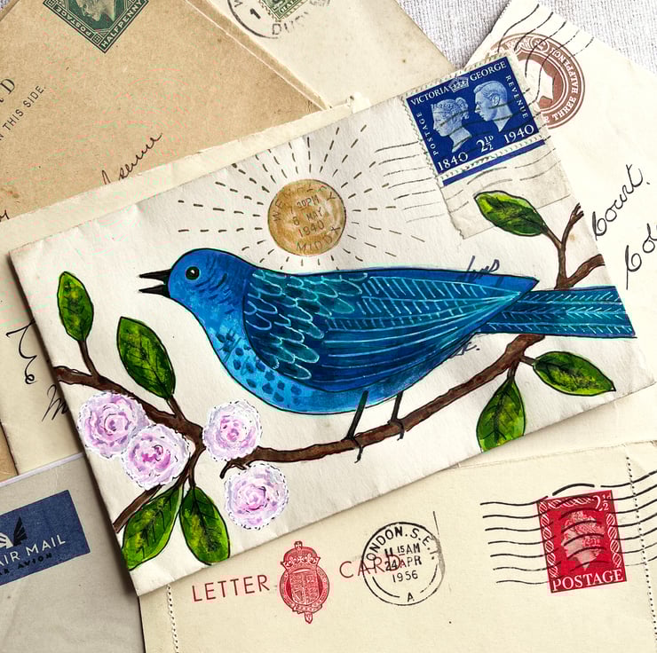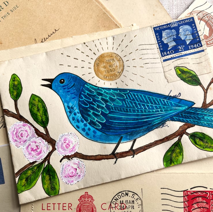 This colourful bird and blossoms has been painted onto a used vintage envelope. The envelope has a 6 May 1940 postmark (which I've turned into a golden sun) and a postage stamp with Queen Victoria and King George.