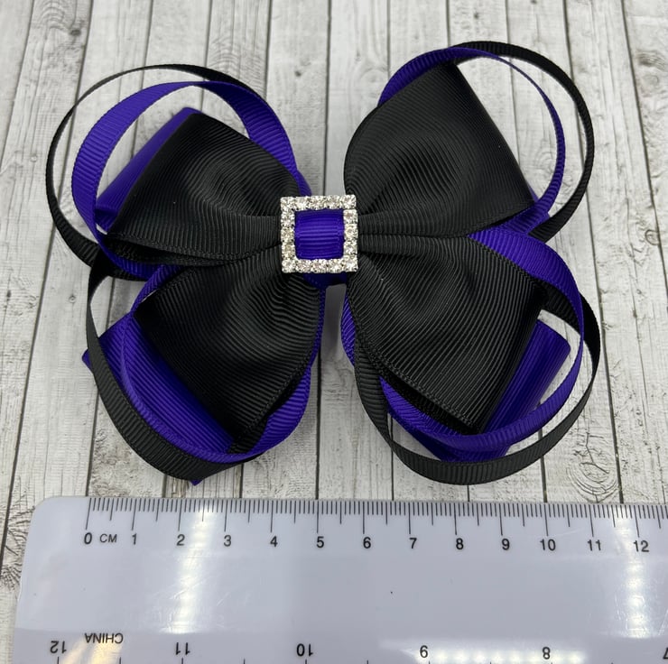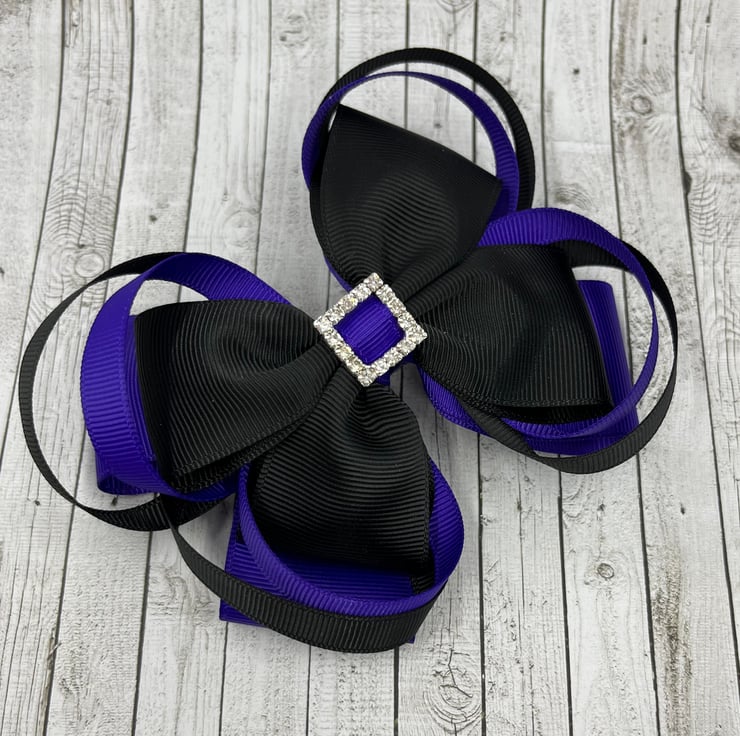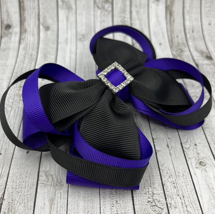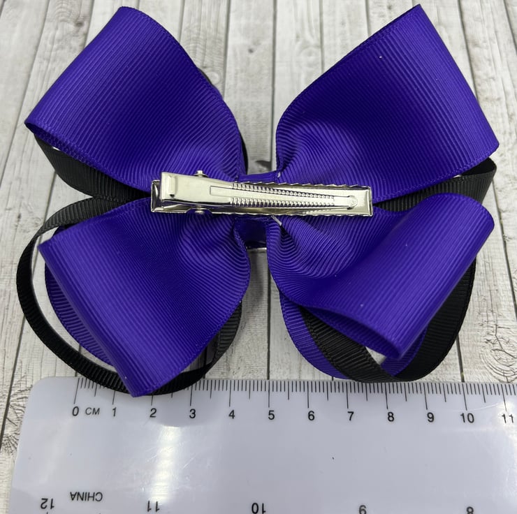 Large 5 inch Black and Purple Double Layer Bow with Double Loops