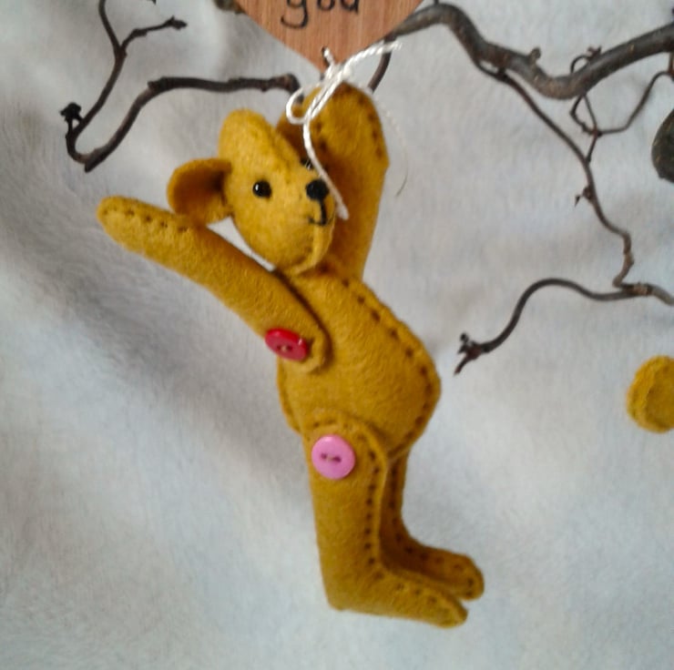 Ted is a 4" bear hand stitched from lovely wool felt and jointed with tiny red and pink coloured buttons so he can be posed into lots of cute positions. His head also moves on a thread joint. His eyes are stitched in tiny obsidian beads with a lovely shine and he has an embroidered face.