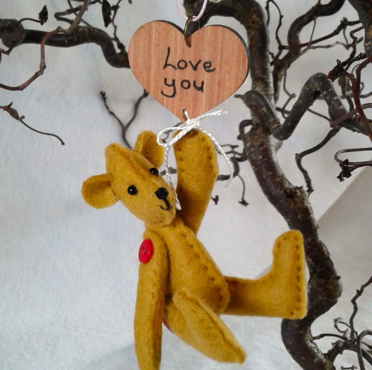 These little 'Sweetheart' bears have been designed to send a message and I can make them with a variety of messages. If I can fit the wording onto a 4cm wooden heart then I will. Messages are burnt on with a pyrography pen so nice and permanent. If you have a particular message in mind please contact me and I'll be happy to help where I can but, as you can imagine, these little bears are very fiddly to make and I would need several days more than just postal time to get them to you.