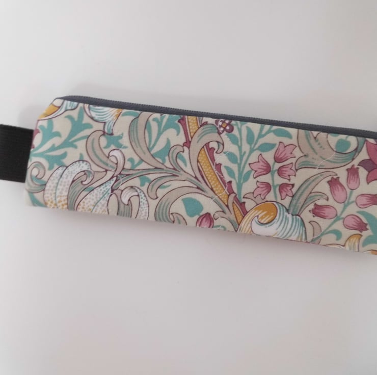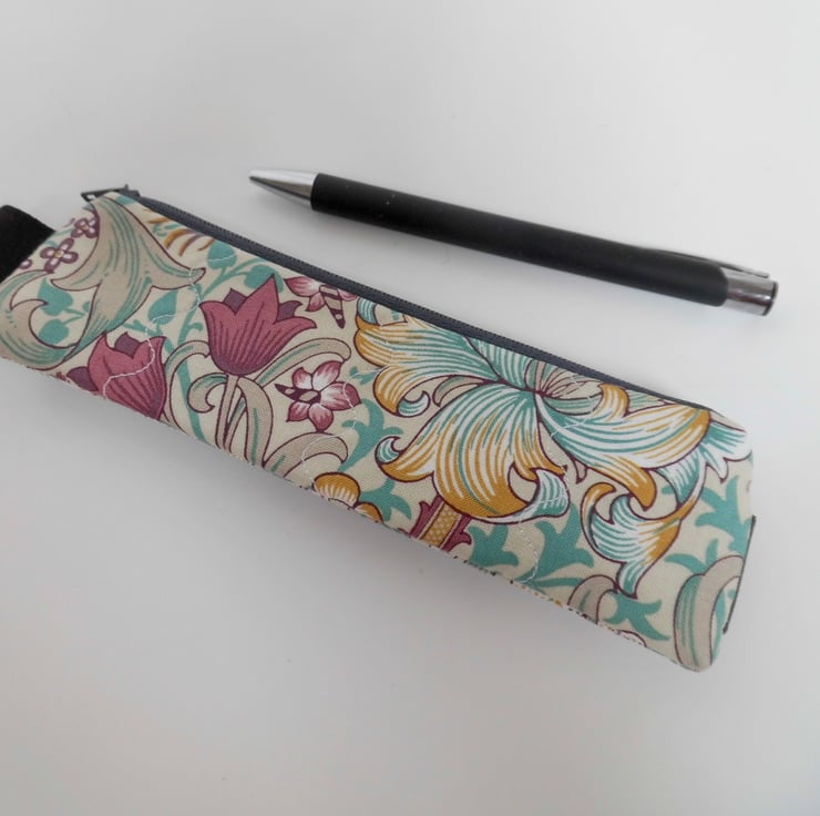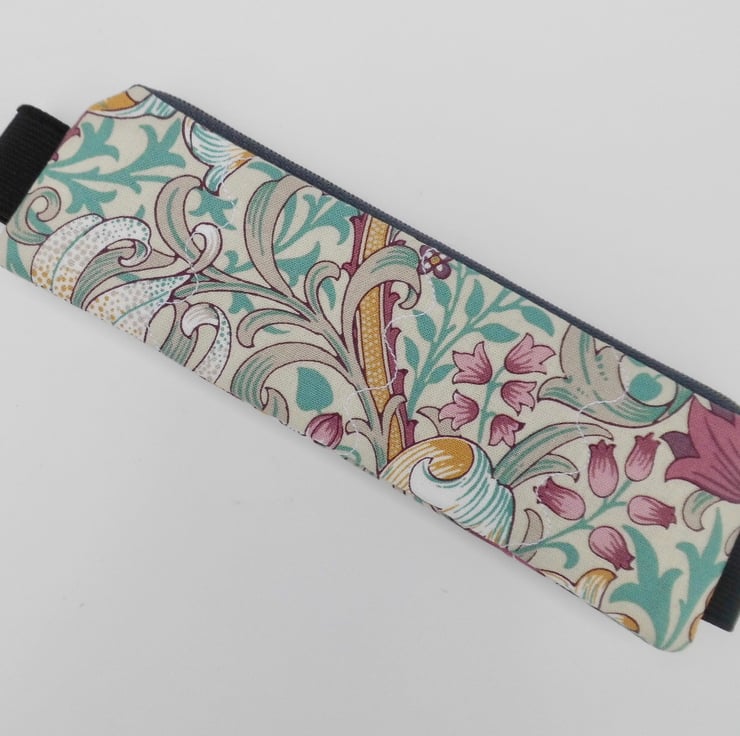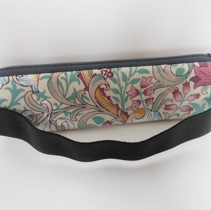 This one is made with a quality quilting cotton printed with William Morris' iconic Golden Lily design in dusk colour way. Lovely shades of plum and soft greens. I backed this fabric with fusible quilter's wadding and then machine stitched down each side with three rows of wave stitch to achieve a lightly quilted effect. The cotton lining is coffee colour with small spots.