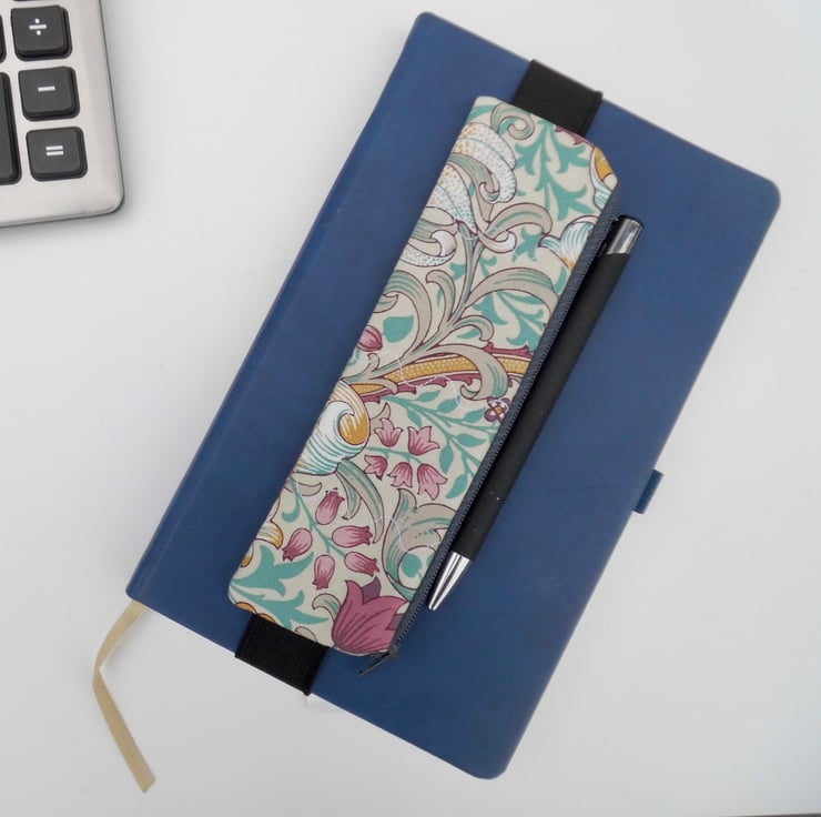 A mini pencil case designed to be kept on the front cover of your diary or journal, held in place with an elastic strap. Just slip it on the front cover and you can always have a pen and pencil to hand. Add it to whichever notebook you are using for the day.