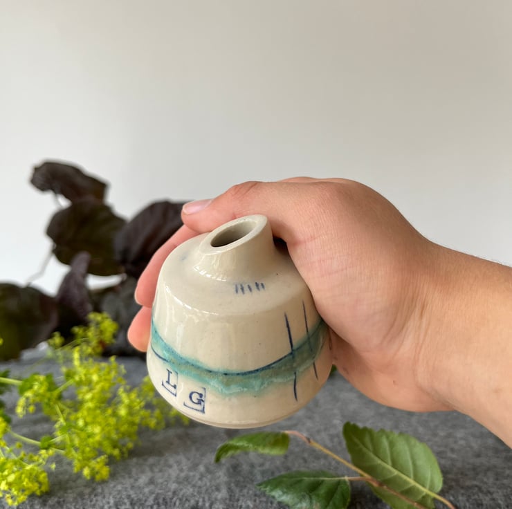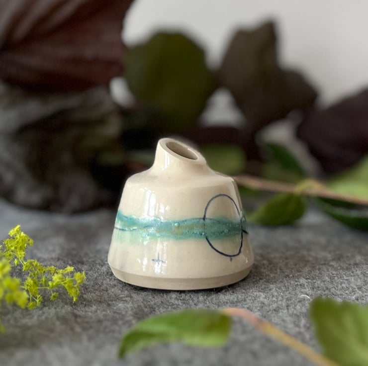A handmade pottery bottle bud vase which is perfect for a couple of stems of flowers brought in from the garden.