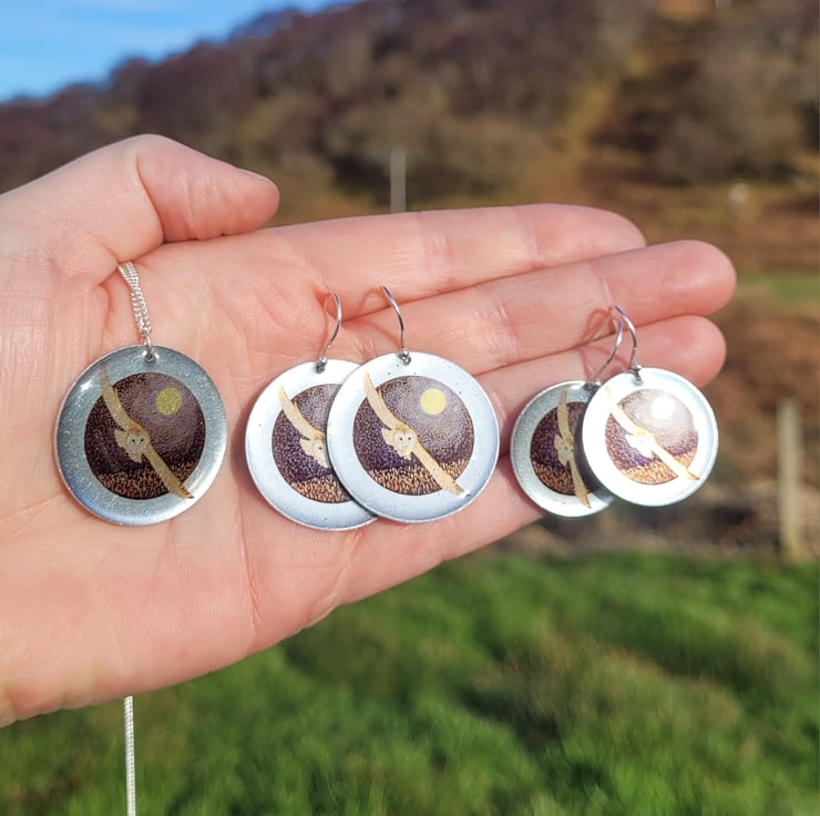 Aluminium and Sterling Silver earrings, approximately 25mm in diameter. The disc is made from aluminium and has had a print of an original artwork by Hannah MacIver transferred on to it, and then sealed in UV resin. Sterling silver ear hooks.