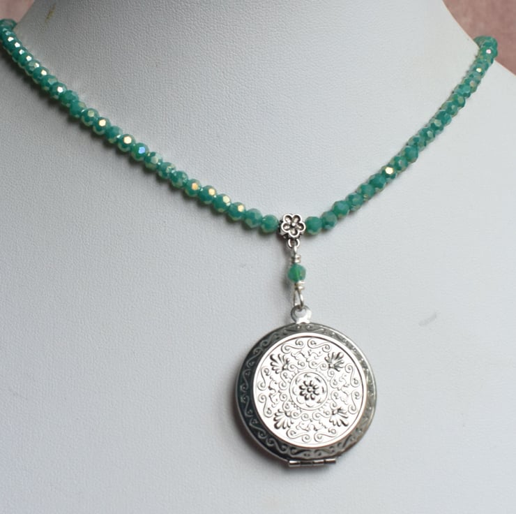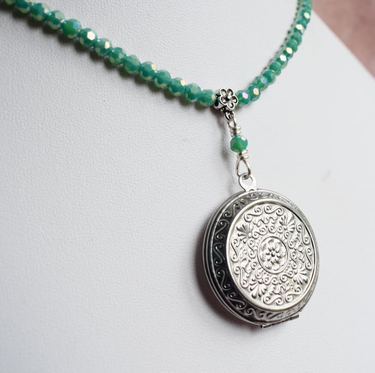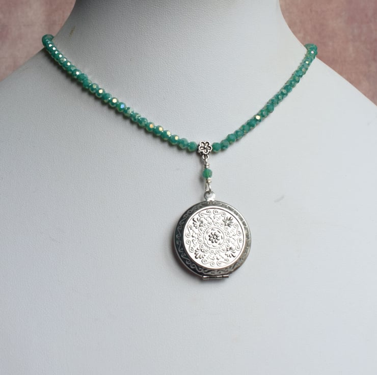 Vintage Style Locket Necklace with Sea Green Beaded Chain