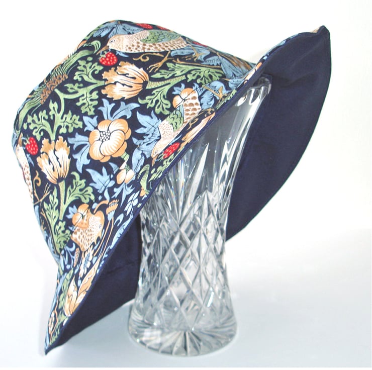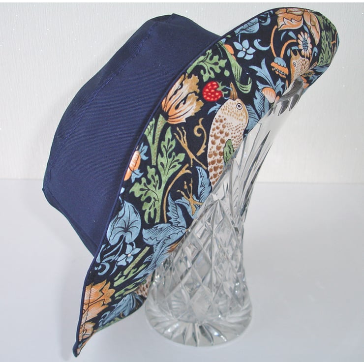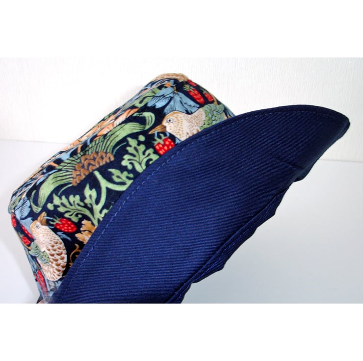 This hat is reversible - The Strawberry Thief pattern one side and plain navy blue the other. It can be worn either way out so full patterned or plain navy with the base of the rim in the pattern.