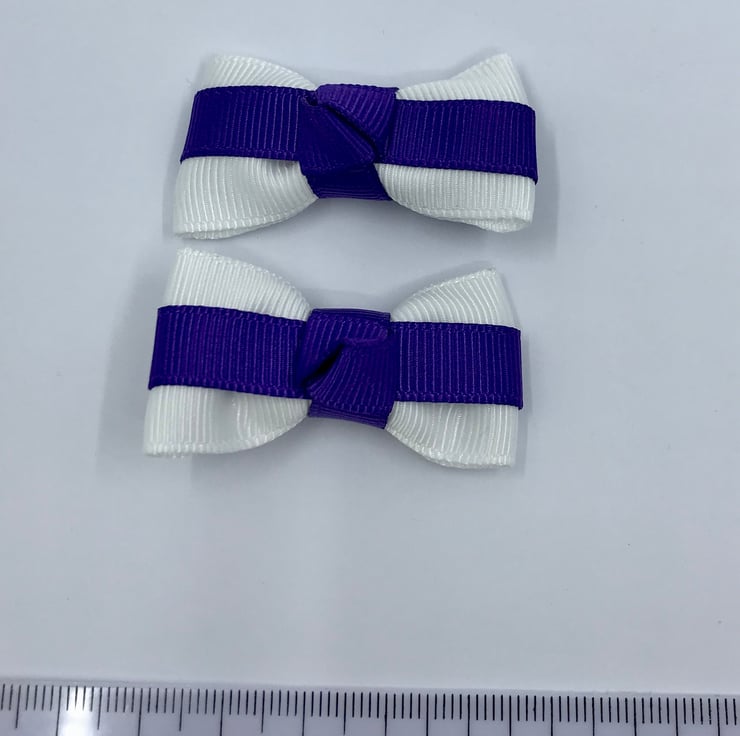 Our Itty Bitty clips are handmade here in our little shop. They are so cute and compliment any school Uniform with purple and white in it. They are ideal for keeping those sneaky little curls from straying into your little one's eyes.