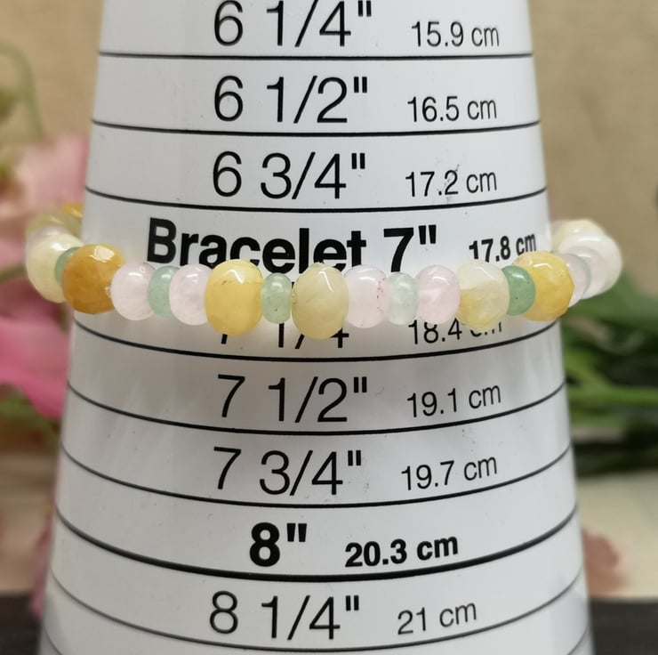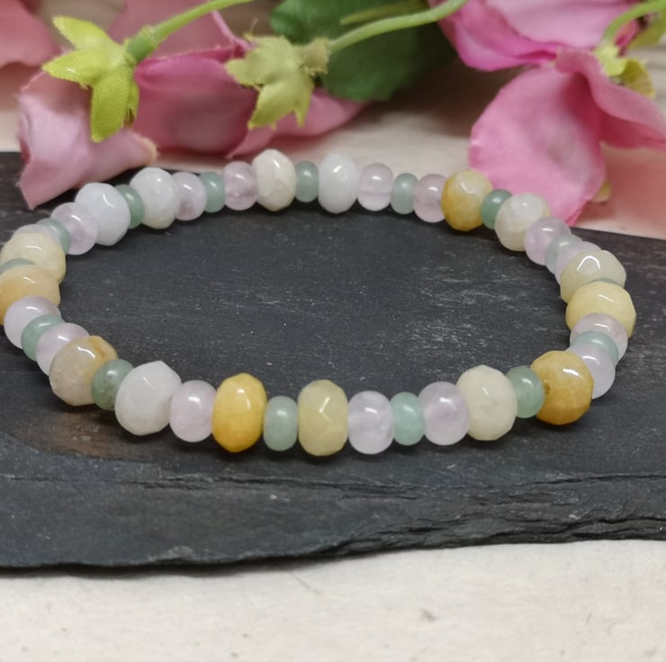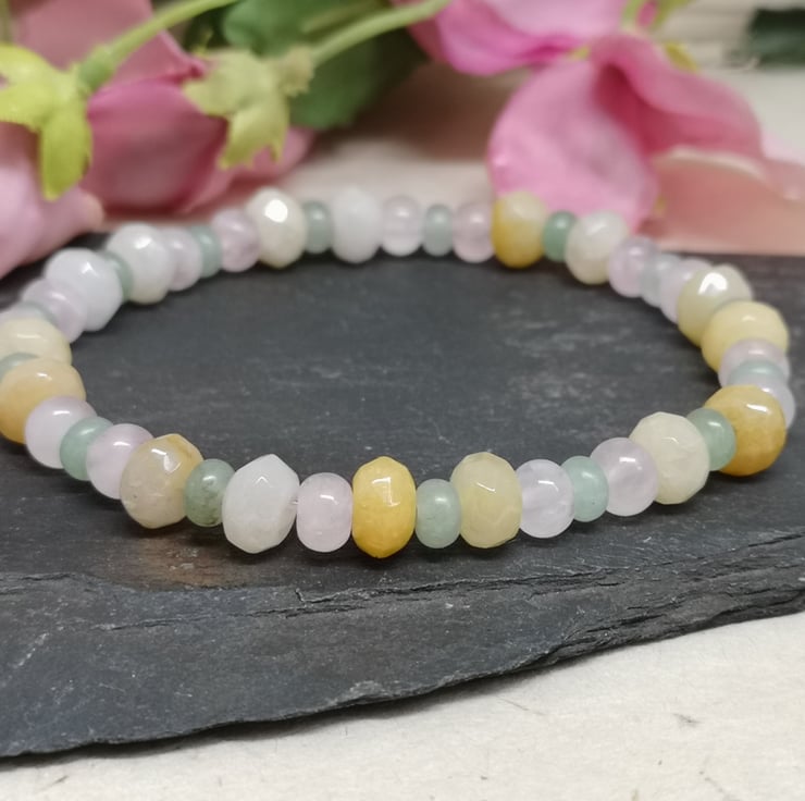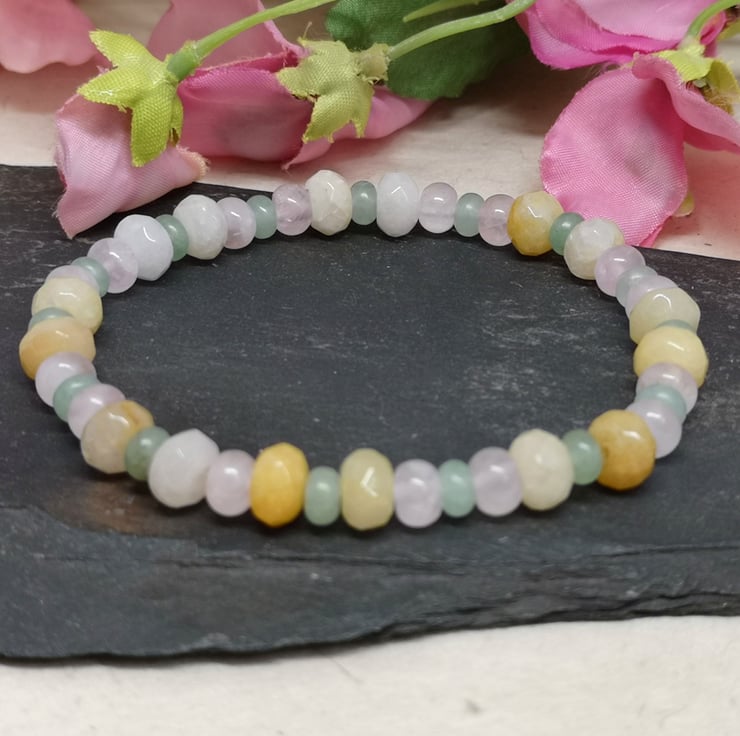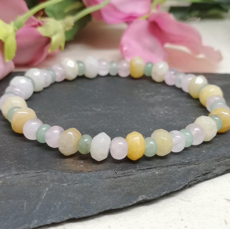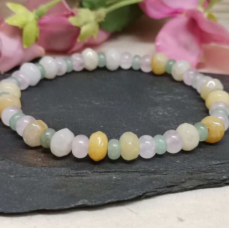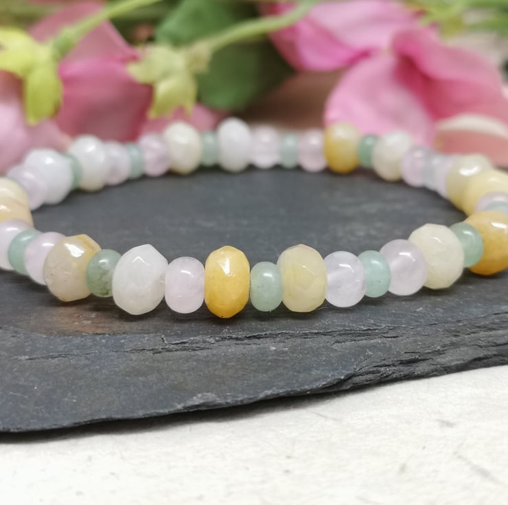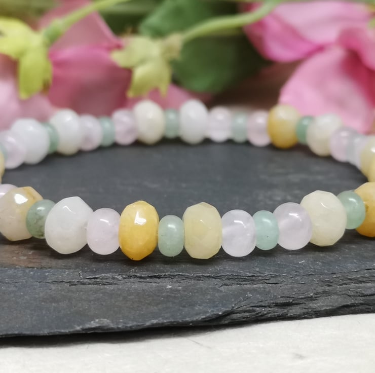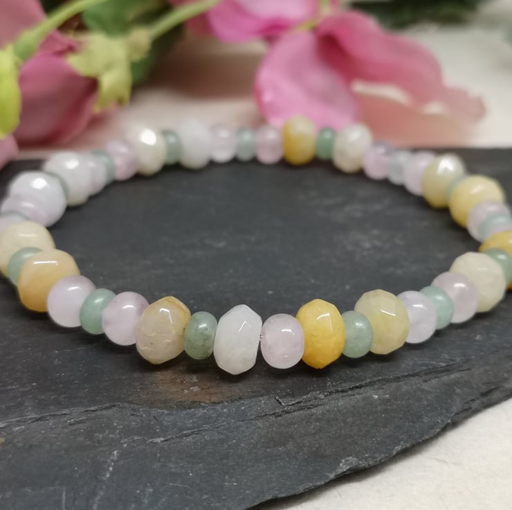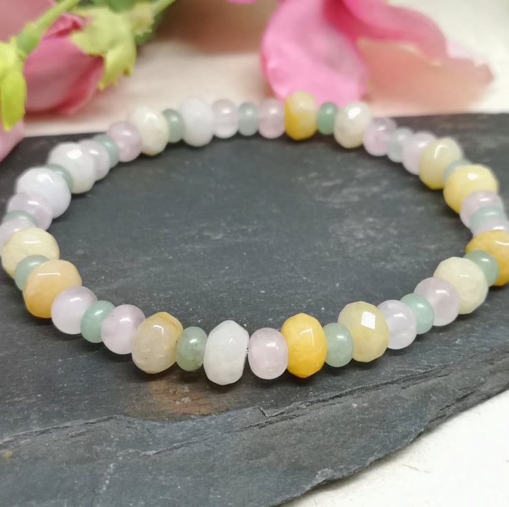 This stretchy bracelet features a trio of pastel coloured gemstones. Rose quartz promotes unconditional love, emotional healing and inner peace. Green aventurine is known as the stone of opportunity, attracting prosperity and success. Yellow jade brings joy and happiness.