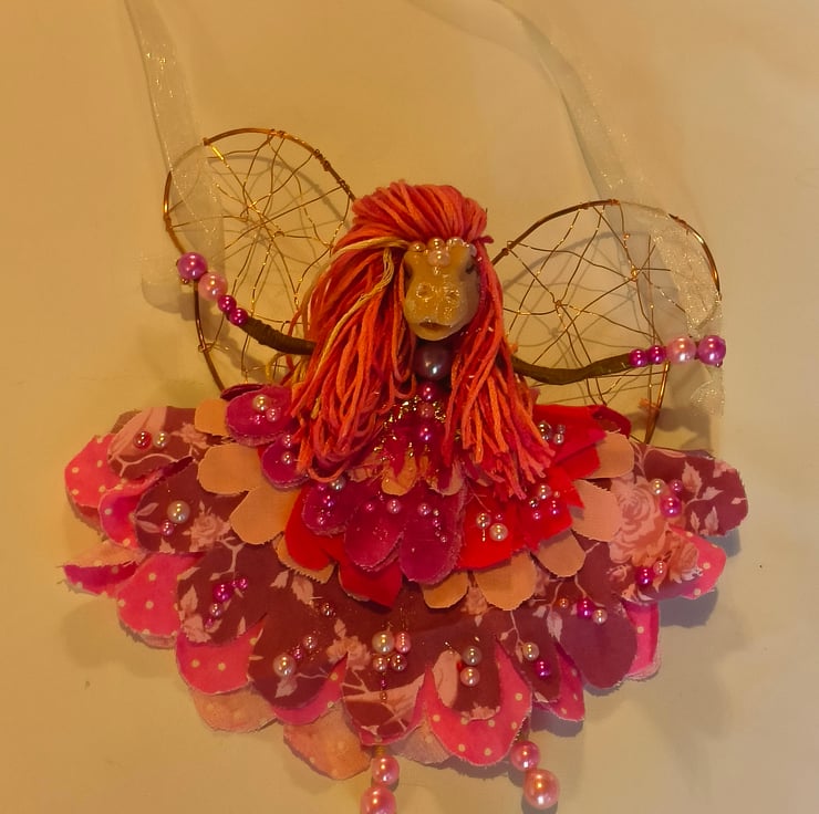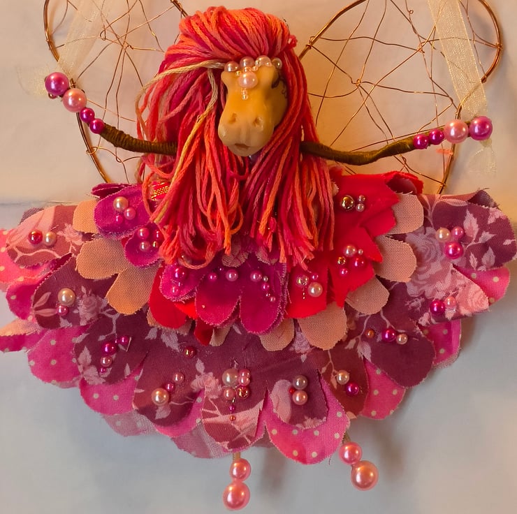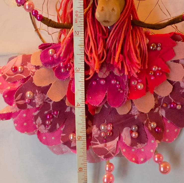 Her wings are also recycled copper wire, her flower skirts are made from scrap fabric that I cut to make the flower petals