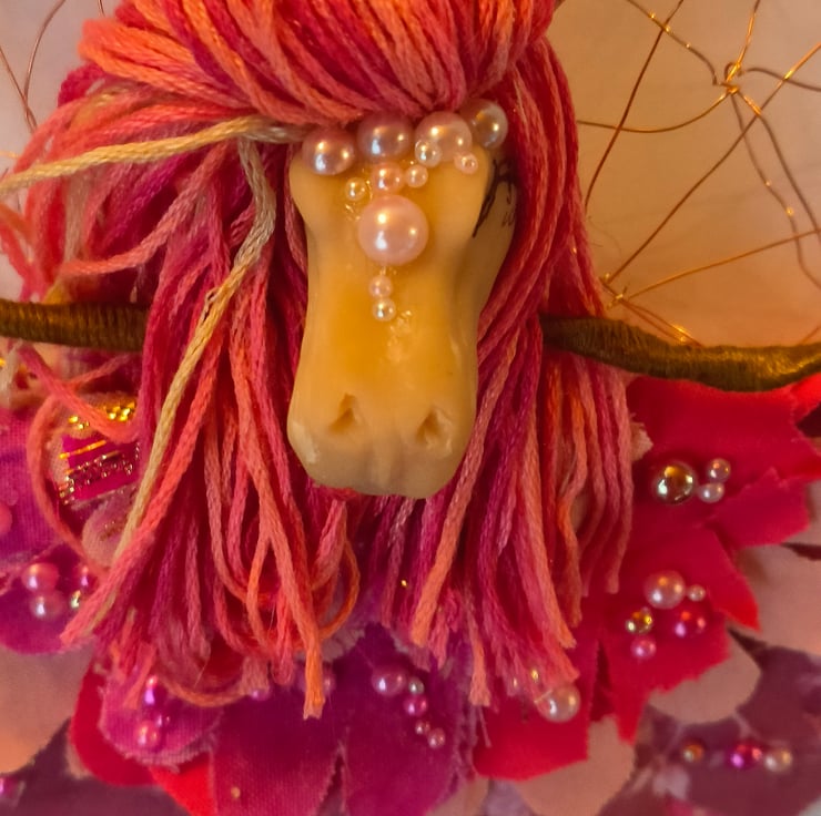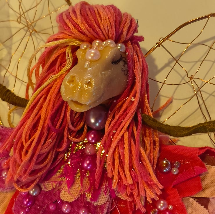 Her body is made from recycled copper wire which I hand strip from electrical cable, which is then shaped and wrapped in cotton thread, her head is a wooden bead which I sculpt the face on out of sculpy clay,