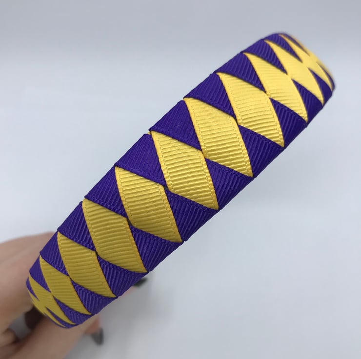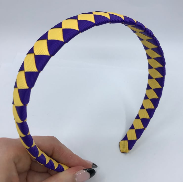 Our Diamond pleated hairbands are handmade here in our little shop. They are so cute the could compliment any school Uniform with purple and yellow gold in it. They are ideal for keeping those sneaky little curls from straying into your little one's eyes.