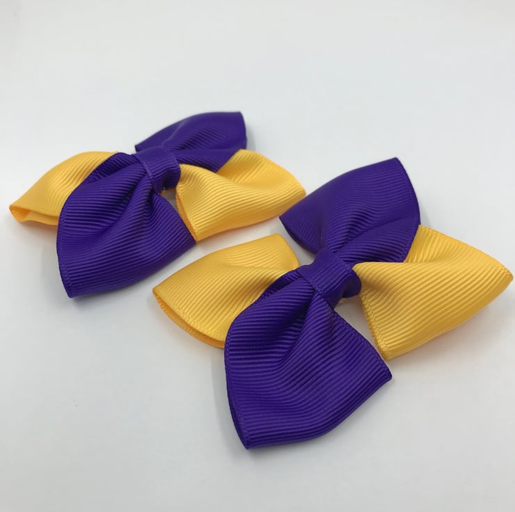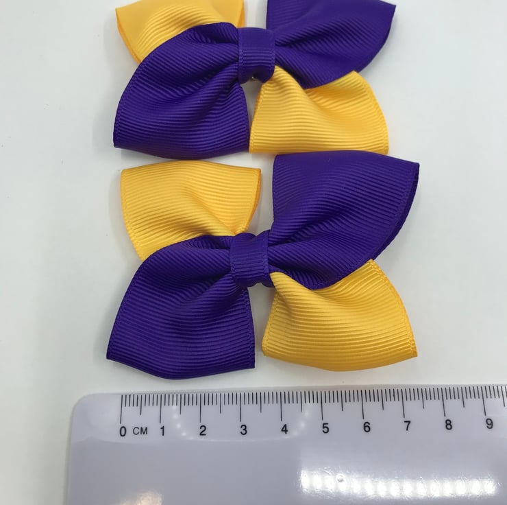 Our square double bows are handmade here in our little shop. They are made from the best quality Grosgrain ribbon. These bows are simple and classic and look extremely smart and go well with the purple and yellow gold School Uniform.