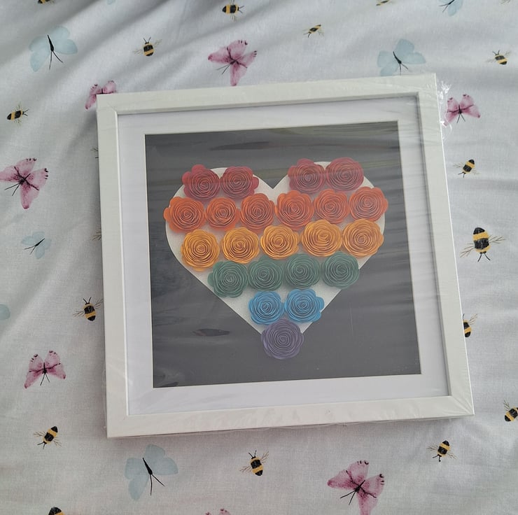 Pride Rainbow 3D Shadow Box Frame Hand Rolled Flowers in Heart Shape Home Décor