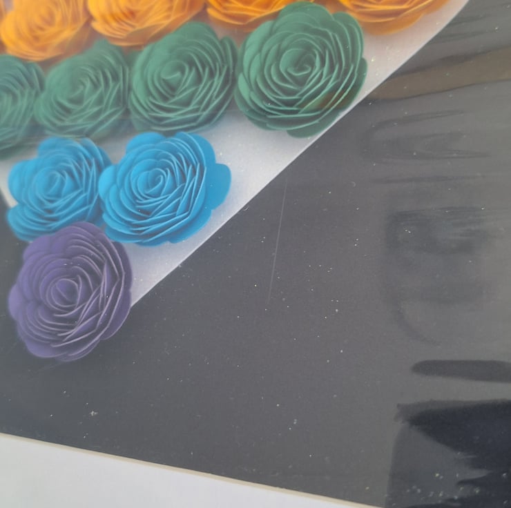 A lovely 3D Shadow Box Frame which was made using individually hand rolled flowers, positioned carefully and stuck firmly in the shape of a heart against a black glittery card background.