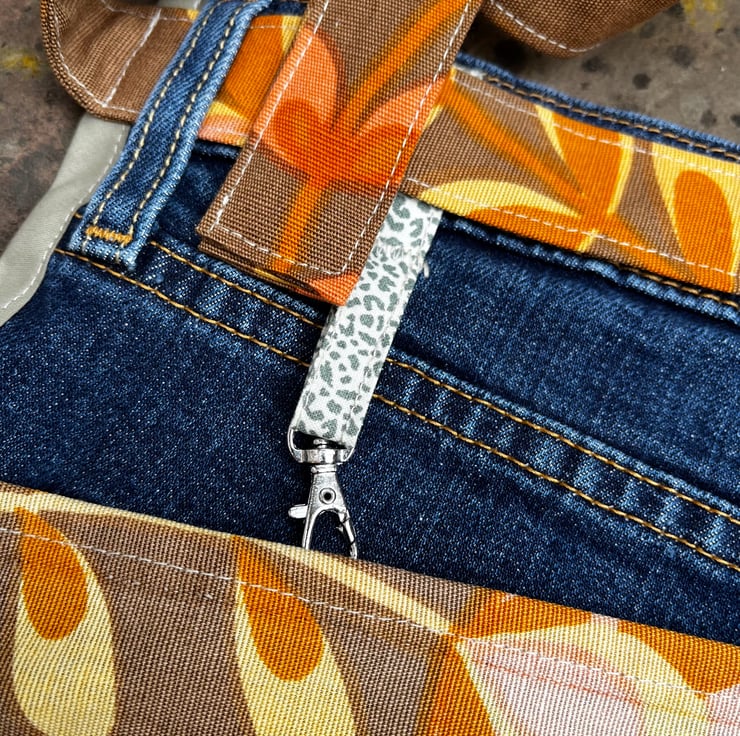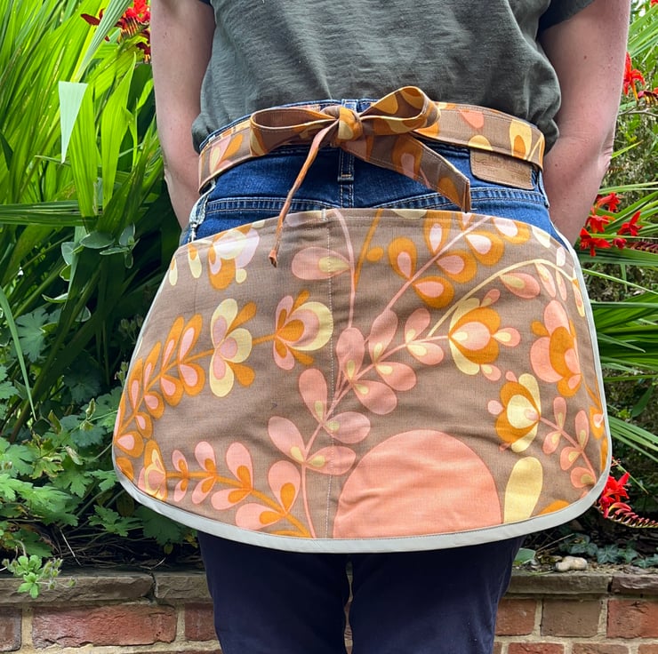 The edges are finished with binding. Waist ties are made from the matching curtain fabric. They measure 260cm from end to end. There is a small clip ideal for keys.