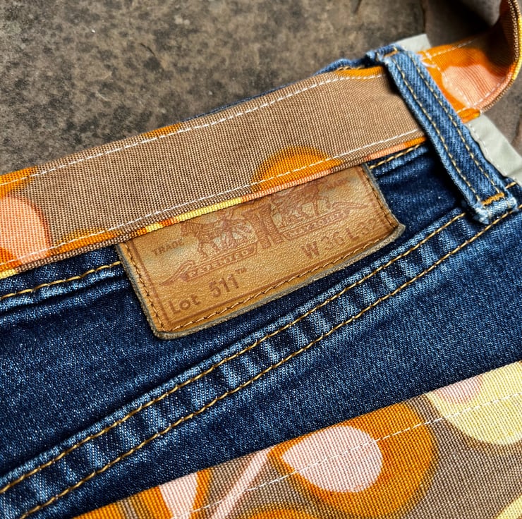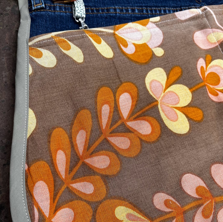 Cute one of a kind apron made from the back of a pair of Levi’s jeans and reclaimed vintage curtain fabric with a retro floral print. There are two pockets from the back of the jeans and two large pockets from the curtain fabric.