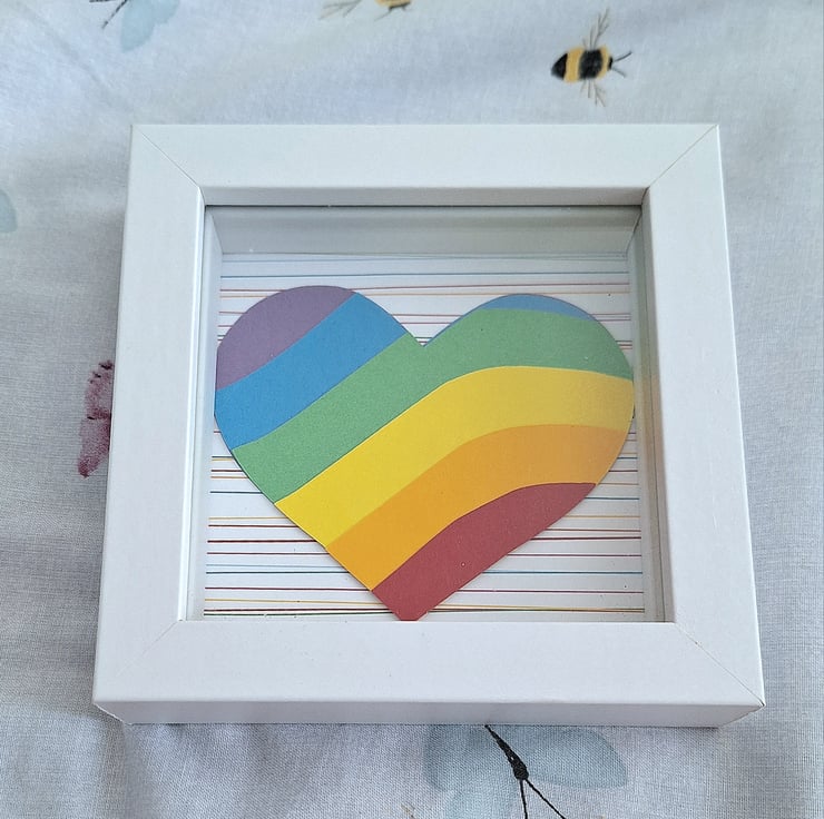 A hand crafted 3D Shadow box frame measuring around 10x10cm. It features a rainbow heart made of hand cut and layered card, against a slightly shiny white and grey background.