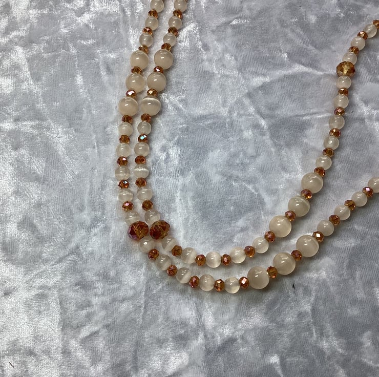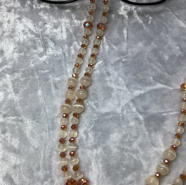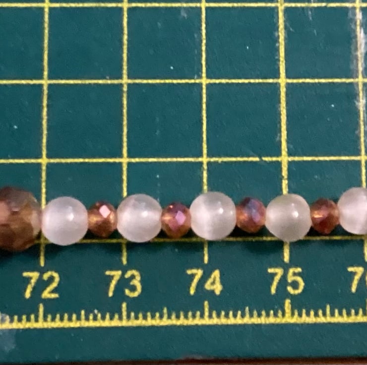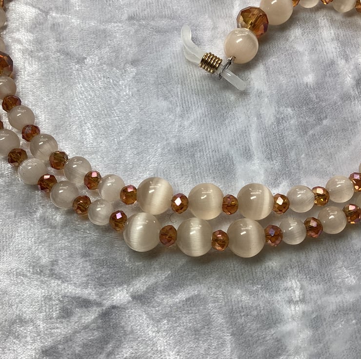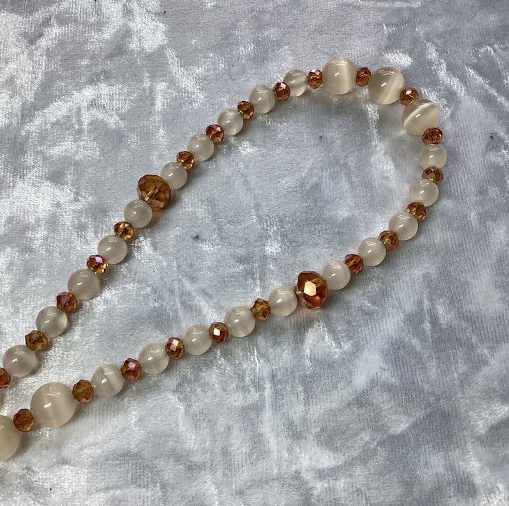 I’ve used Natural Moon Stone Beads in Light Champagne Cat Eye Beads , Glass Czech Beads and 20 mm Rubber Connectors .