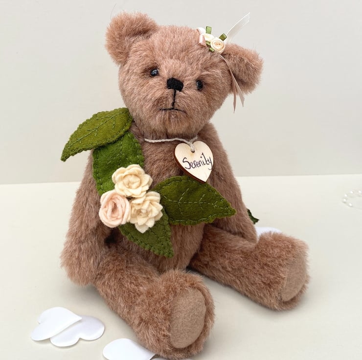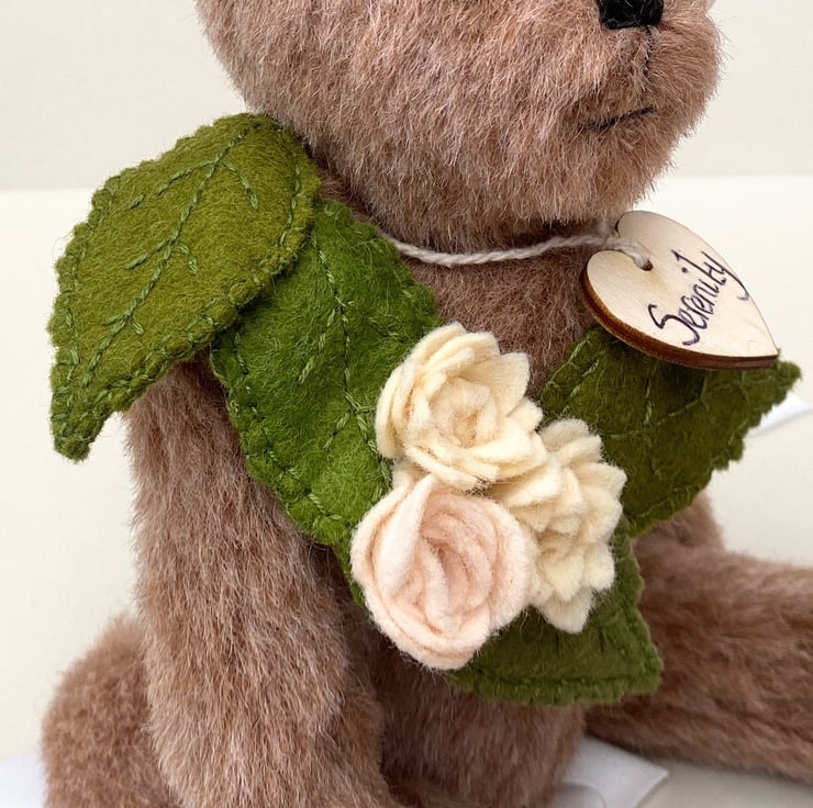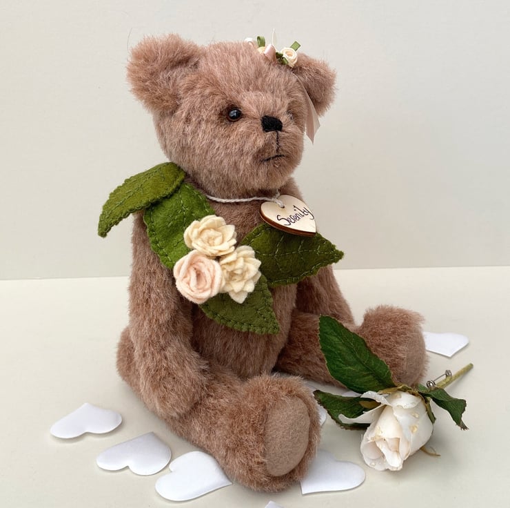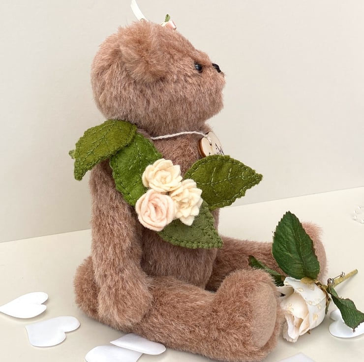 She has been decorated with hand sewn wool felt leaves in olive and deep woodland greens with 3 roses in ivory, fawn and peach which fall down one side of her body from her shoulder, a little corsage of leaves make her a truly unique little bear and a beautiful display piece.