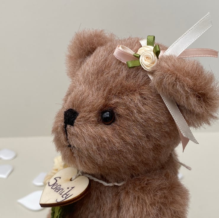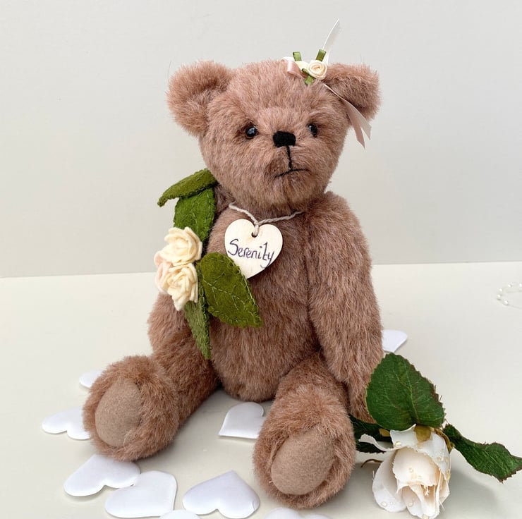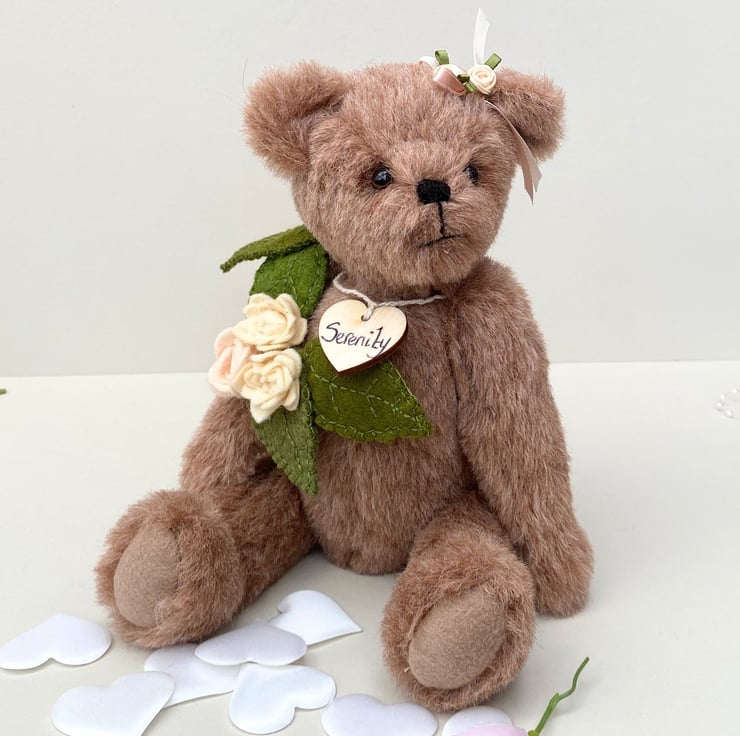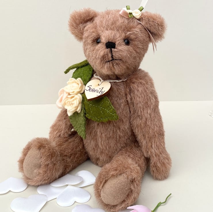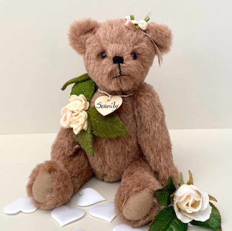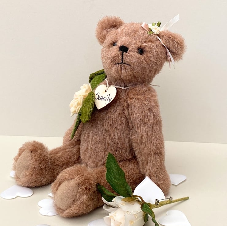 Meet Serenity, a beautiful collectors bear, handcrafted from 11mm dense alpaca mohair fabric in almond blush. Standing at approx 11.5 tall Serenity is a unique heirloom collectable bear.