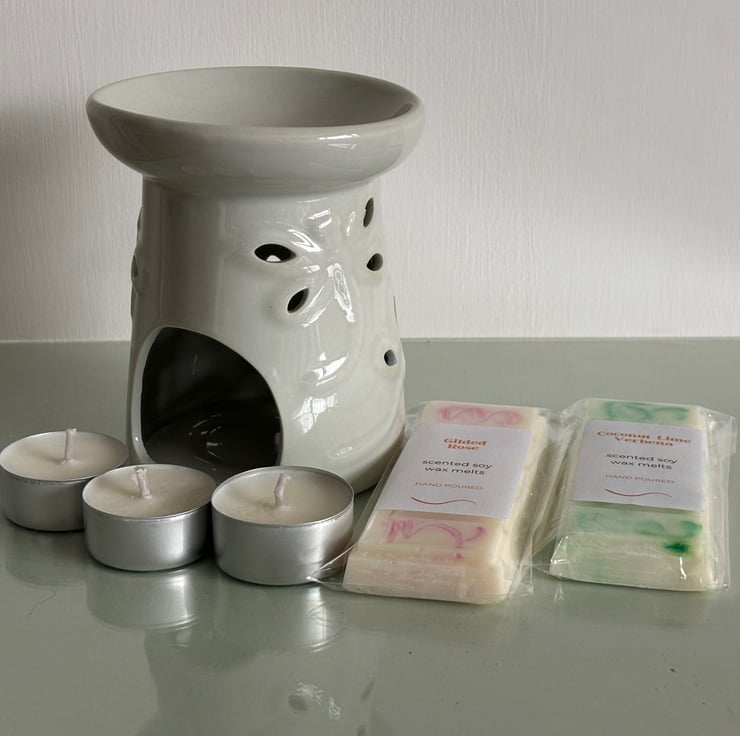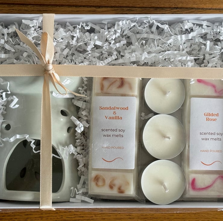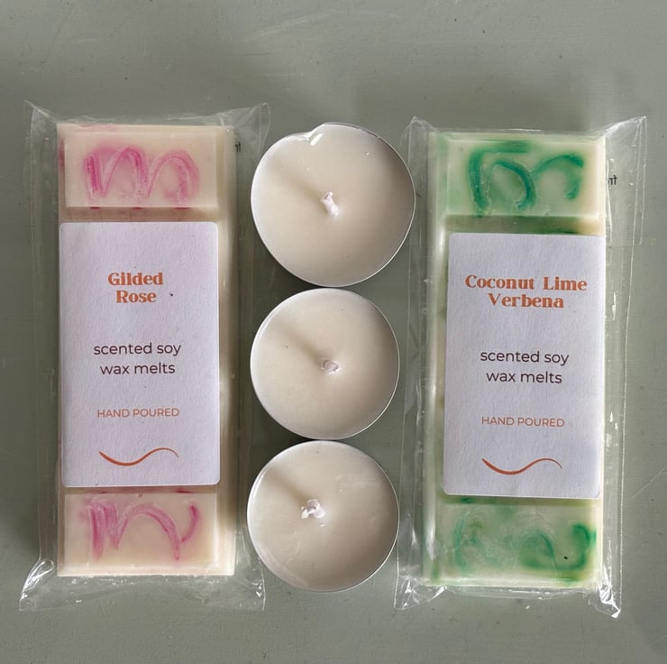 Each box will contain 2 hand poured soy wax snap bars of difference scents and 3 hand poured soy wax tea lights.