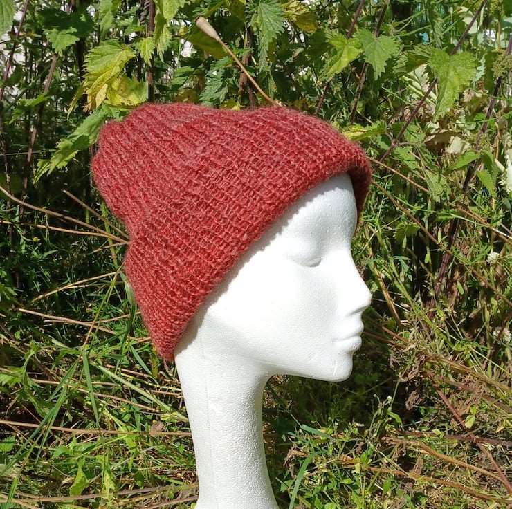 Hand spun, hand dyed, handmade beanie hat made with the fleece from my lovely Gotland sheep. Gotland fleece is light-weight, soft and warm. Ideal for when you are out and about on colder days.