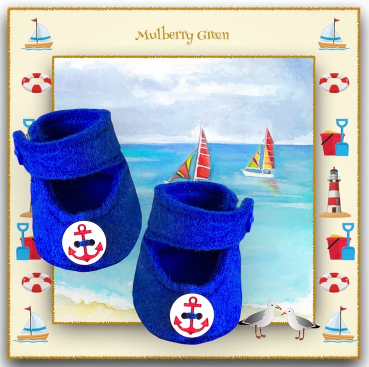 A smart little pair of royal blue shoes, decorated with little anchors, to fit the Mulberry Green characters. The shoes look lovely with the little dresses.