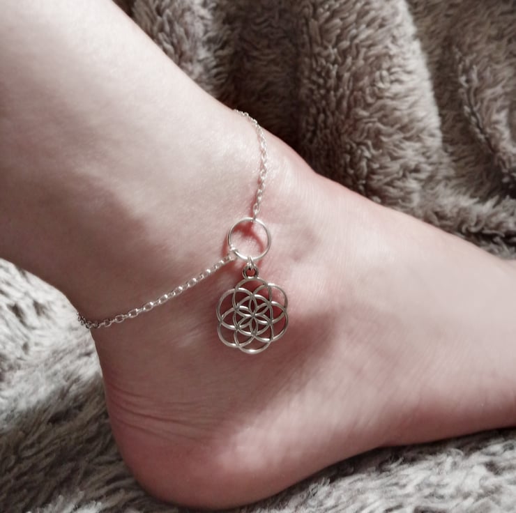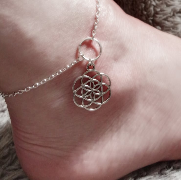 This beautiful Anklet features a flower of life charm on silver plate chain.
