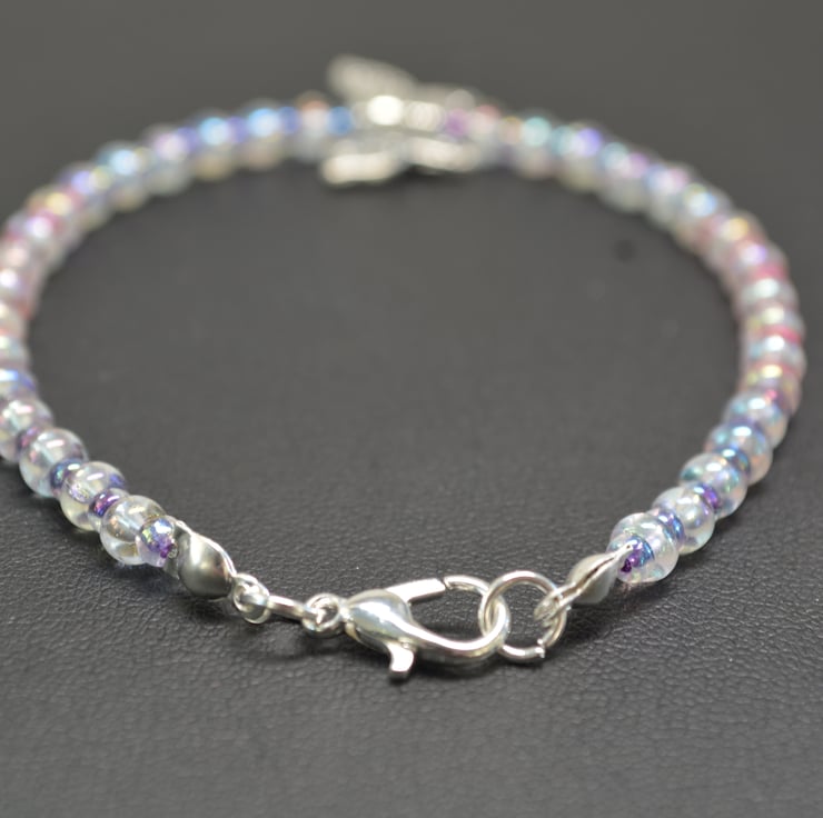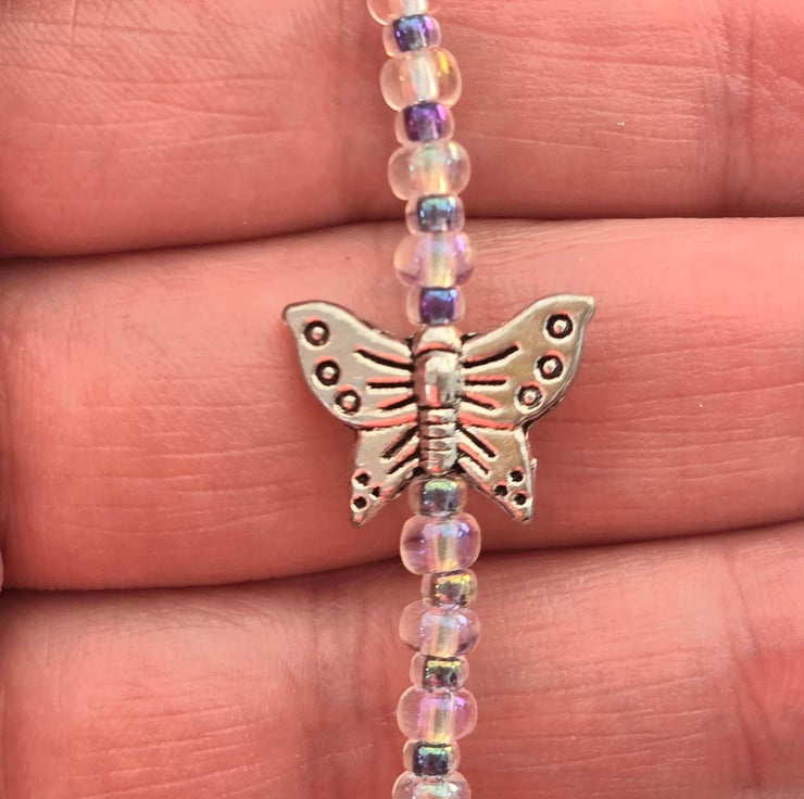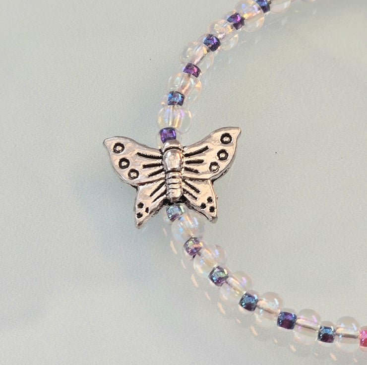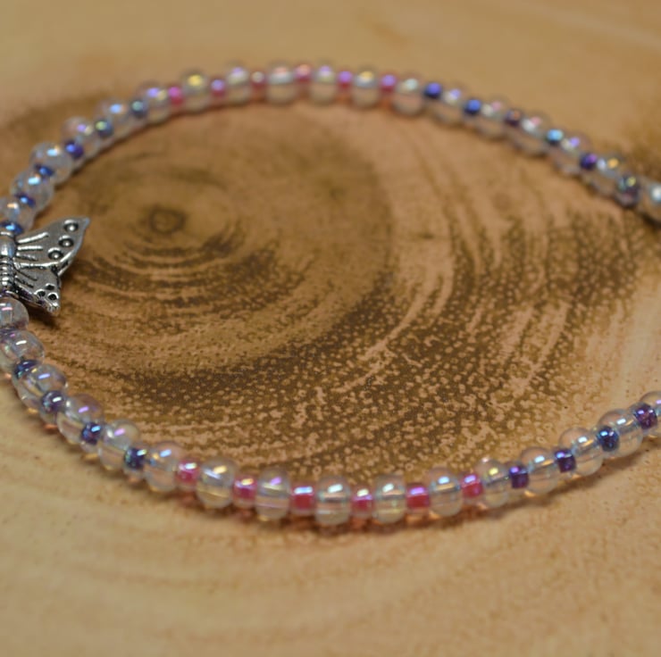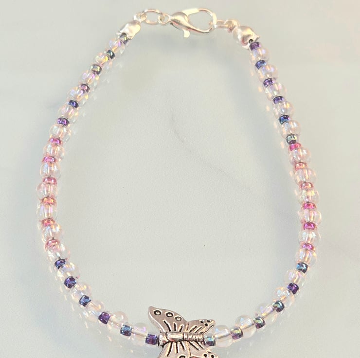 The bracelet has been made using large clear crystal AB seed beads with small pink and amethyst seed beads in between. The pink and amethyst beads divide the bracelet up into three equal parts on each side with a metal butterfly charm in the centre of the bracelet. The butterfly charm is 16x12mm and is on its side on the bracelet.