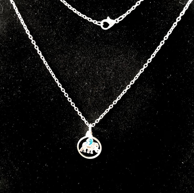 A beautiful necklace featuring an elephant with a small faceted turquoise crystal bead. Pendant size 13mm.