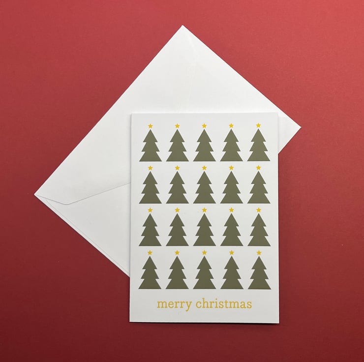 A pack of five Christmas cards with a bold, minimalist design featuring a Christmas tree and the words 'merry christmas'. There is a set of matching gift tags available in the shop.