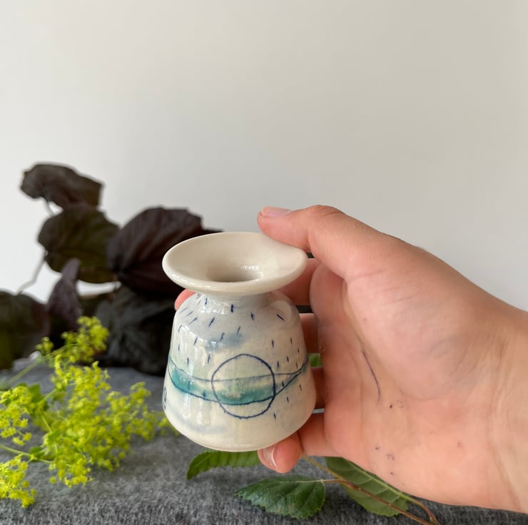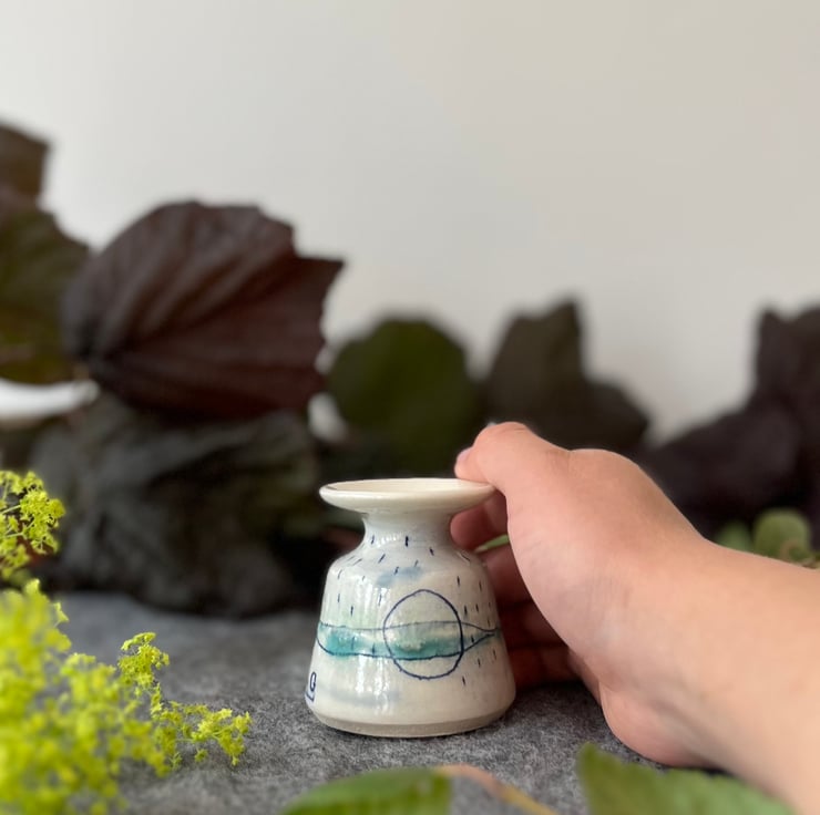 A handmade pottery bottle bud vase which is perfect for a couple of stems of flowers brought in from the garden.