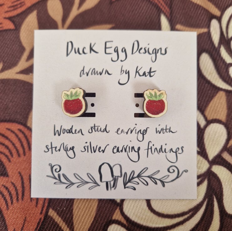 Wild strawberry stud earrings illustrated by me and made in my little studio using FSC certified wood charms and sterling silver earring findings.