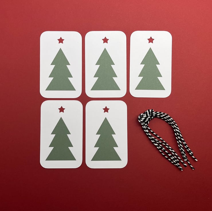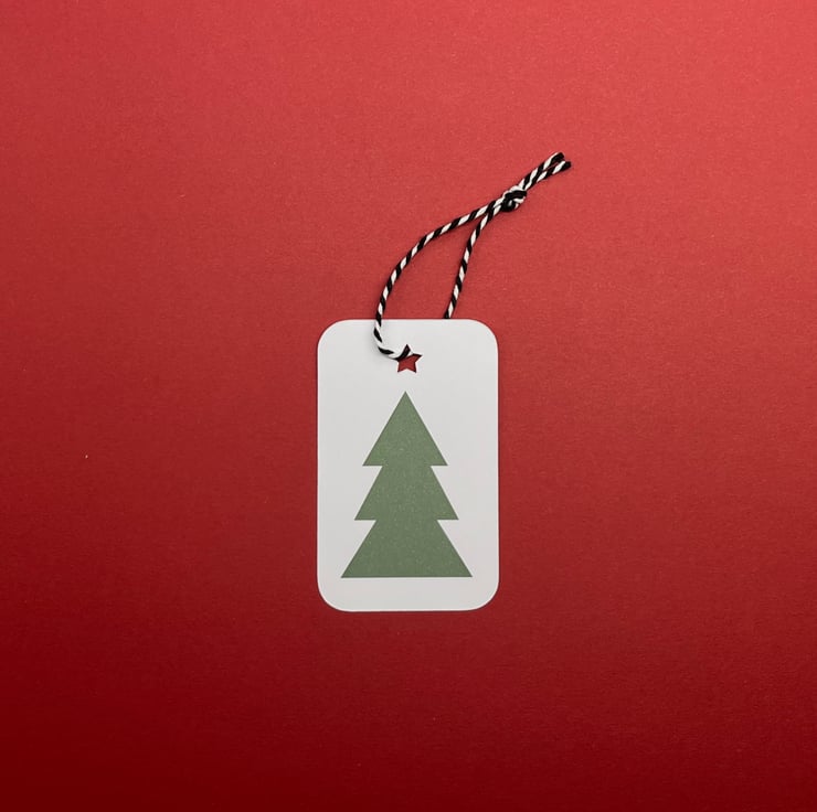 Pack of five gift tags with a bold, minimalist design featuring a Christmas tree. The star at the top of the tree has been cut out to place a piece of cord through so it can be attached to your gifts. x5 pieces of black and white cord have been provided. There is also a set of matching Christmas cards available in the shop.