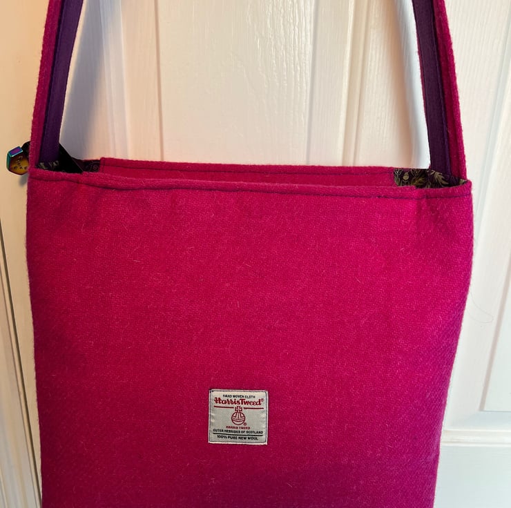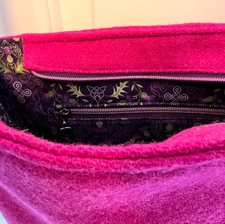 This is a large shoulder or crossbody bag handcrafted in the most beautiful cerise pink Harris Tweed