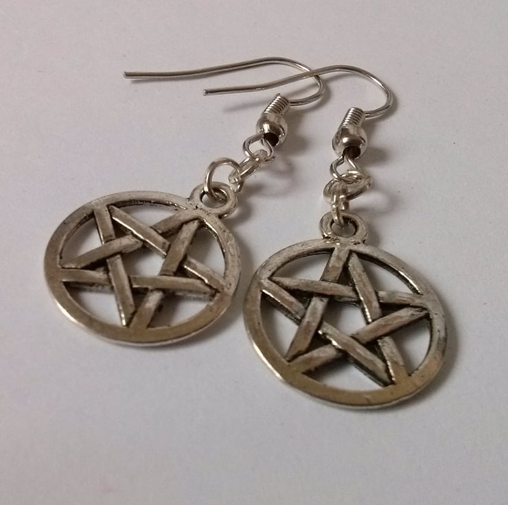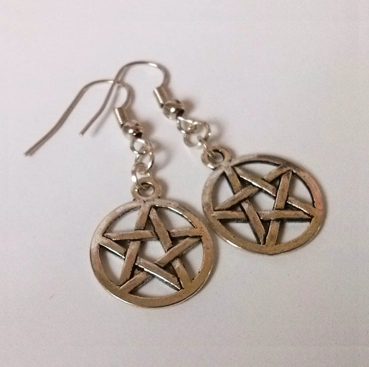 These nice earrings have simple pentagram charms hanging on silver plate hooks.