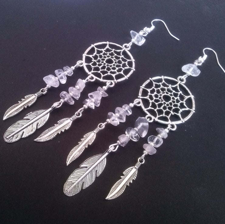 These wonderful earrings have beaded clear quartz dreamcatchers hanging on silver plate hooks.