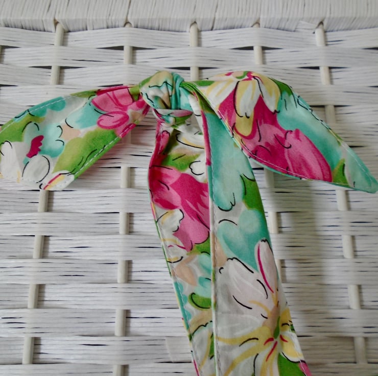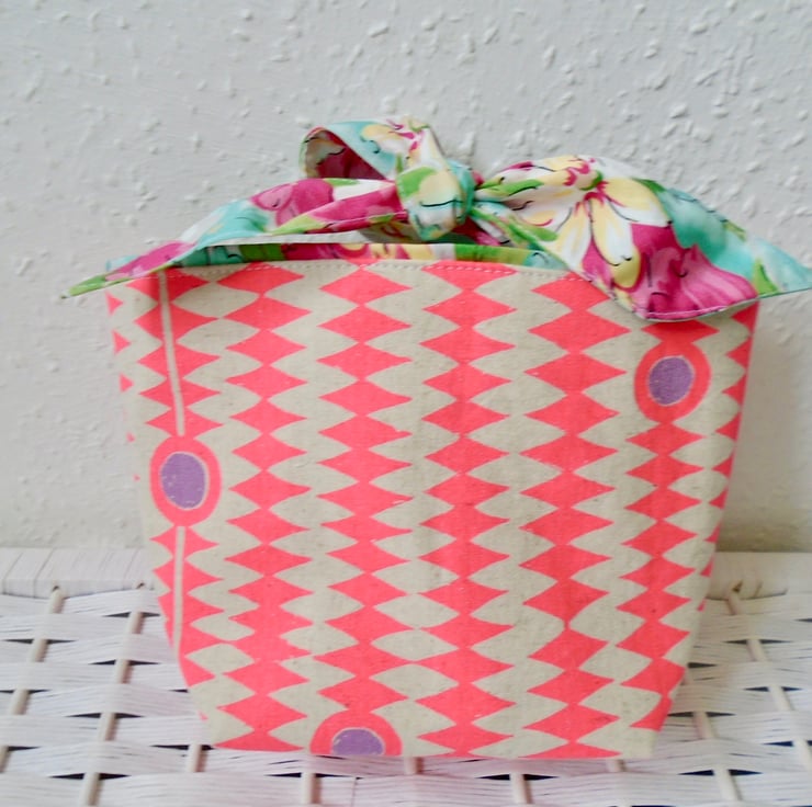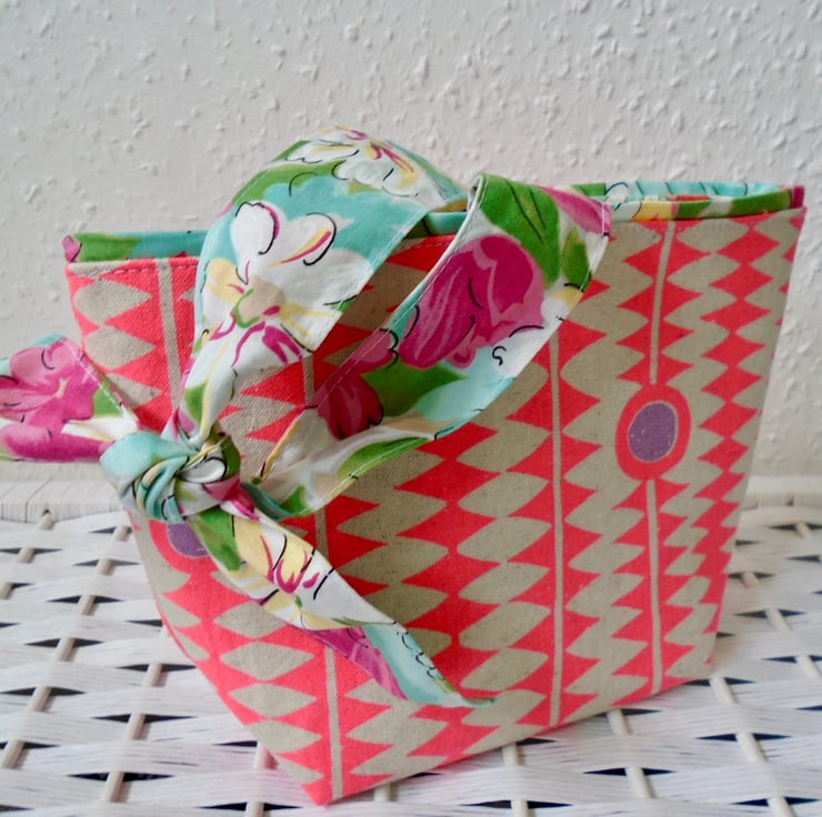 Straps made in the floral fabric ( straps tied in a bow ) , and the trim round the top edge , also made in the floral fabric