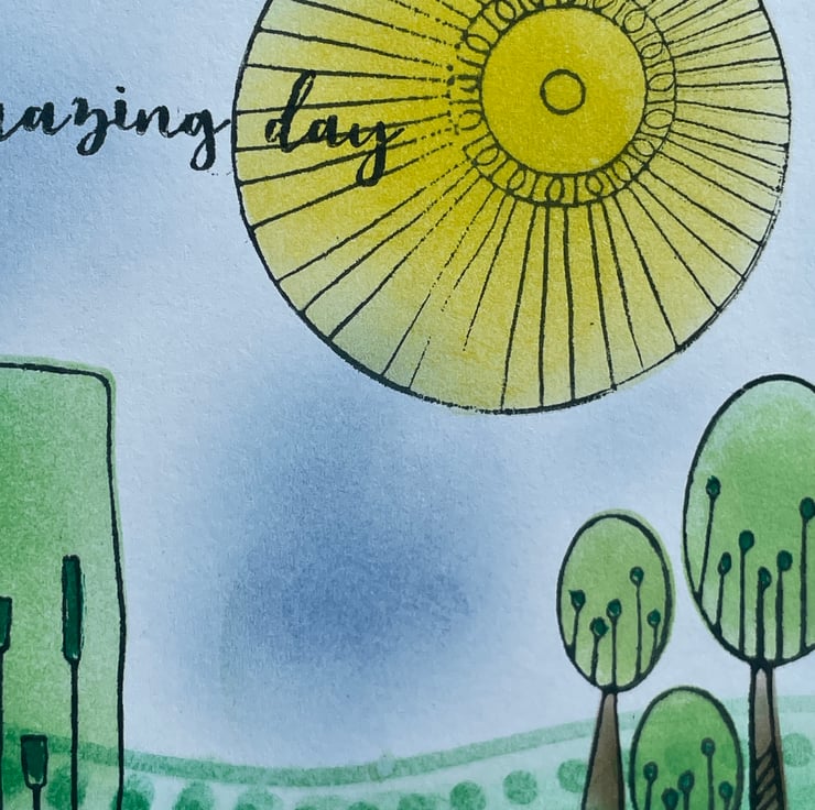 A cute and quirky card. This fantasy landscape is on a 15x15cm card. There are rolling hills, novel trees, a field of flowers and a hug shining sun. All these are created using stencils, stamps and blending inks. This is all hand done so any imperfections are to expected and add to the uniqueness of the mini work of art. The greeting says Have an amazing day so could be used for several different occasions. Inside the card is blank for your own greeting.