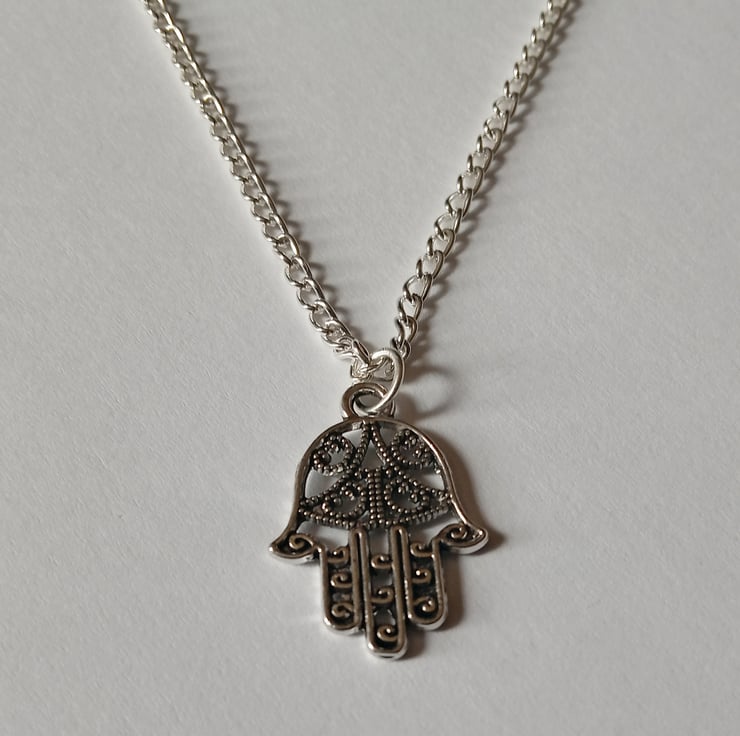 This stunning necklace has a filigree hamsa hand pendant hanging on 18" silver plate chain.