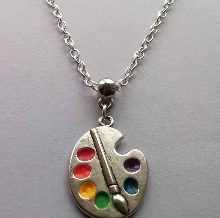This beautiful necklace has an enameled artist palette pendant hanging on 18" silver plate chain.