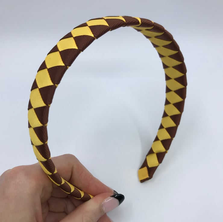 Our Diamond pleated hairbands are handmade here in our little shop. They are so cute the could compliment any school Uniform with brown and yellow gold in it. They are ideal for keeping those sneaky little curls from straying into your little one's eyes.