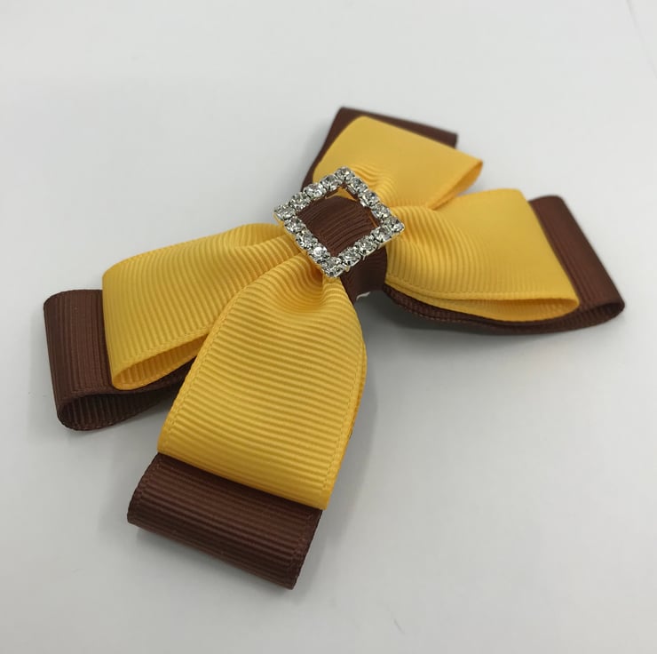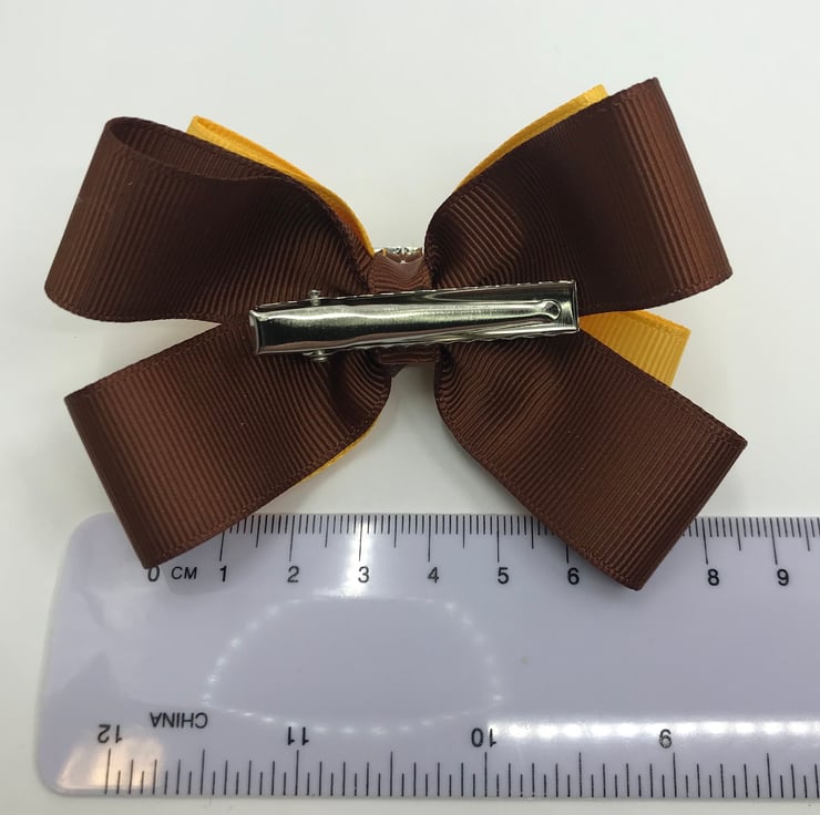 Our double bows are handmade here in our little shop. They are made from the best quality Grosgrain ribbon. These bows are really elegant and look extremely smart and go well with the brown and yellow gold School Uniform.