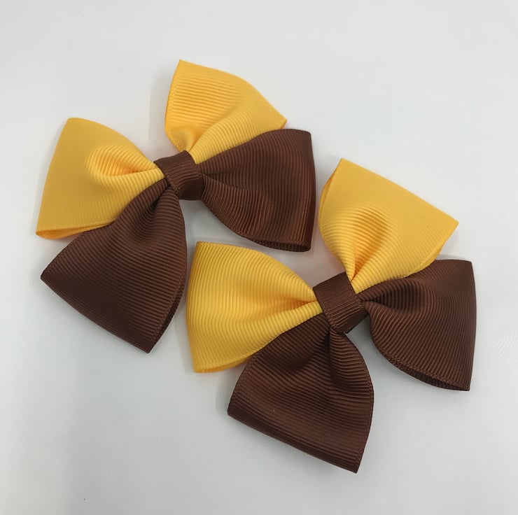 Our two tone double bows are handmade here in our little shop. They are made from the best quality Grosgrain ribbon. These bows are simple and classic and look extremely smart and go well with the brown and yellow gold School Uniform.