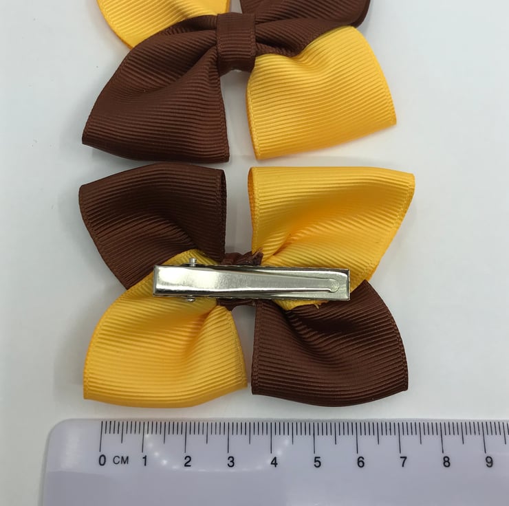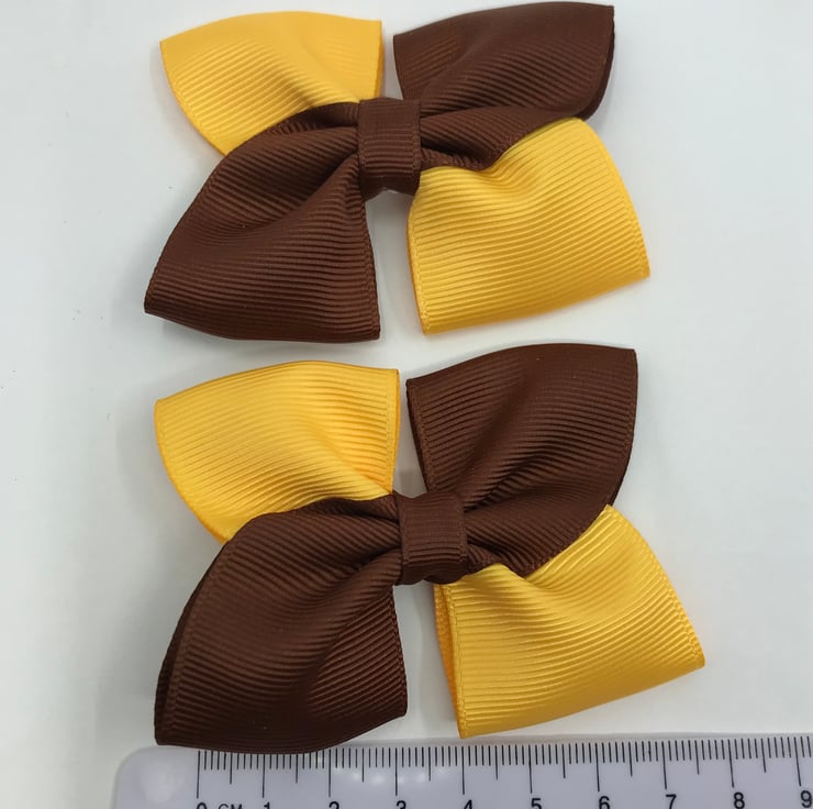 Our square double bows are handmade here in our little shop. They are made from the best quality Grosgrain ribbon. These bows are simple and classic and look extremely smart and go well with the brown and yellow gold School Uniform.