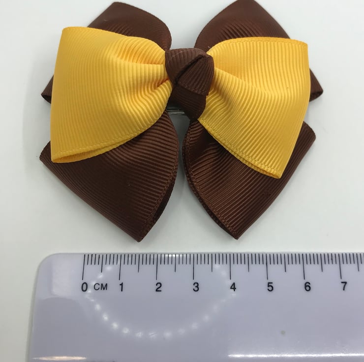 Our top knot bows are handmade here in our little shop. They are made from the best quality Grosgrain ribbon. These bows are really elegant and look extremely smart and go well with the brown and yellow gold School Uniform.