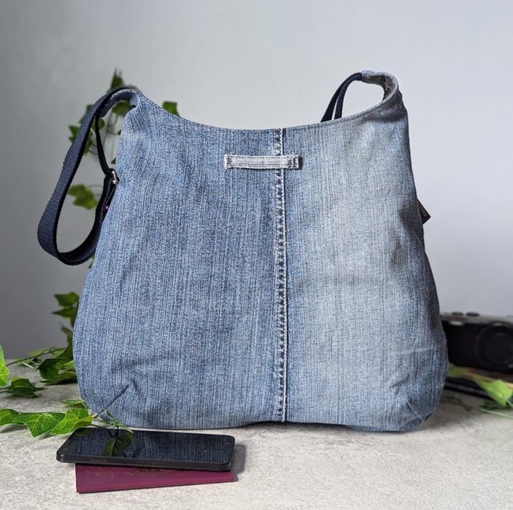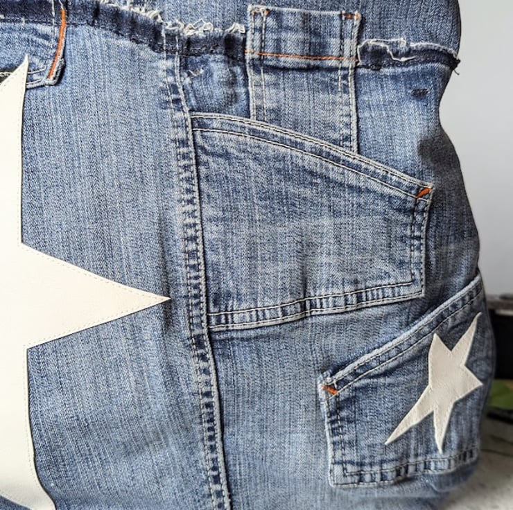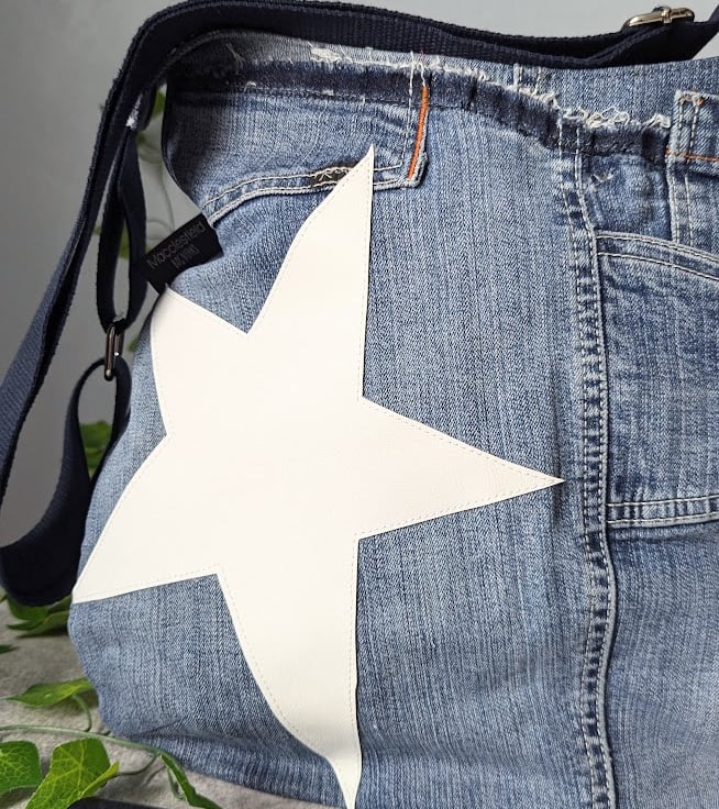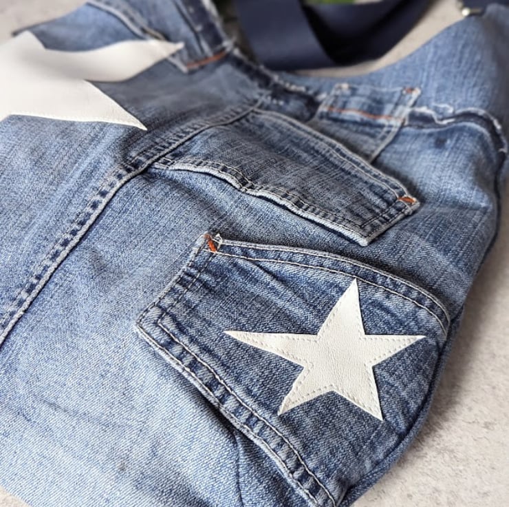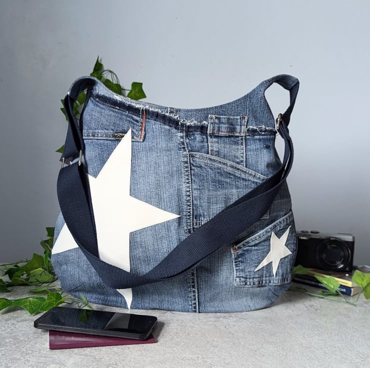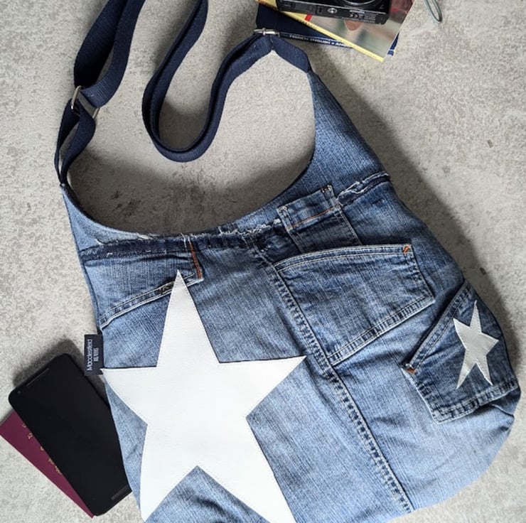 Two white star motifs make this recycled vintage denim cross body hobo bag unique and stylish and perfect for summer. Carefully assembling sections of vintage denim jeans, it has a wonderfully worn and slightly grungy look. Dress it up or dress it down, it’s slouchy and perfect for all your everyday essentials and more!
